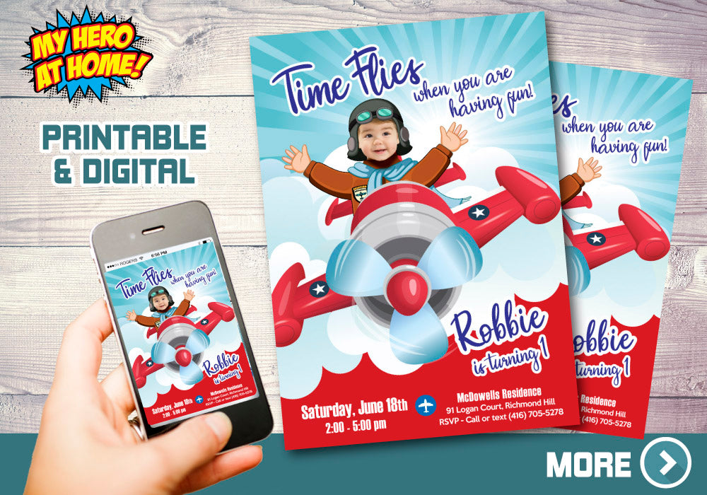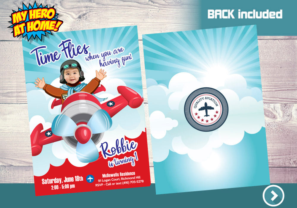 Airplane Time Flies birthday Invitation with your kid as the pilot, Vintage Plane template. 547