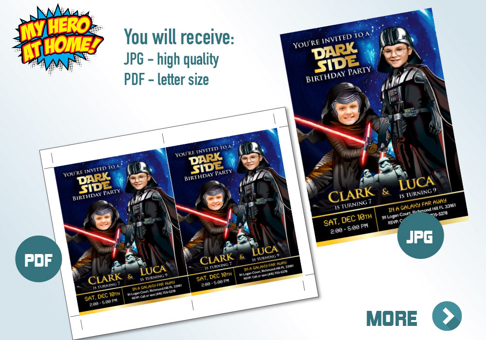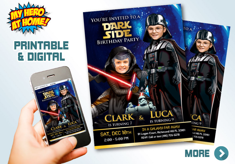Darth Vader and Kylo Ren Birthday Party Invitation with kids as the starr, Joint dark side party. 617