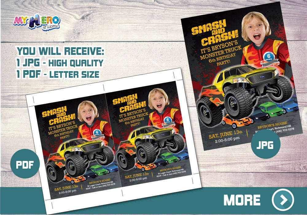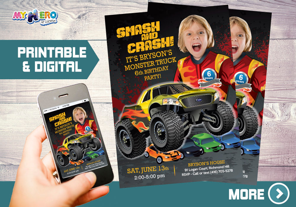 Monster Truck theme party, Monster Truck party decor, Monster Truck invitation with photo, Smash and Crash digital invite, Smash and Crash Jam birthday.