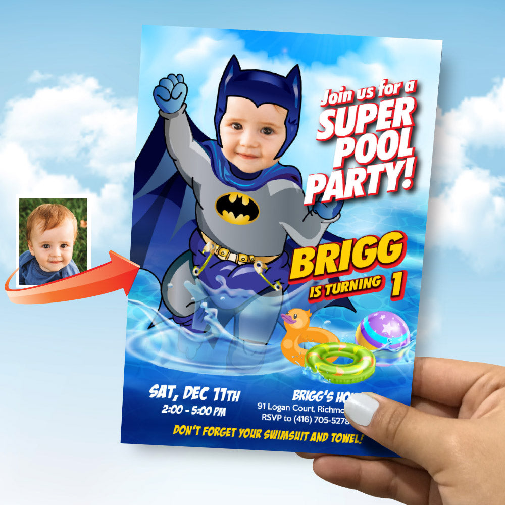 Baby Batman Pool Party invitation with your baby as the star, Batman Splash Party, Baby Batman photo Invite. 728IN