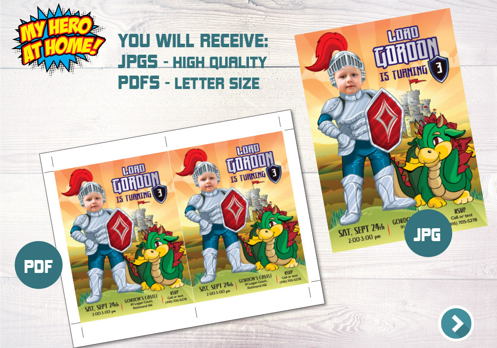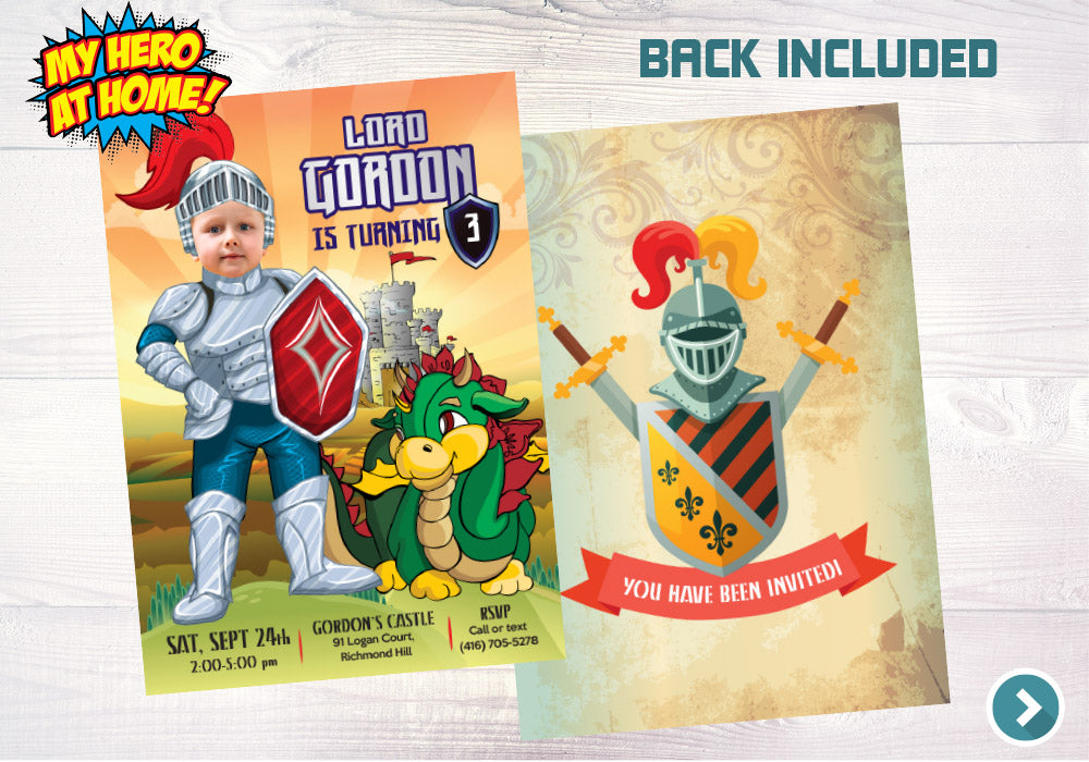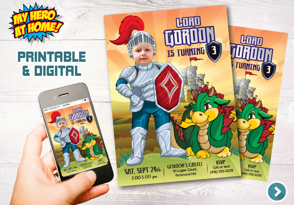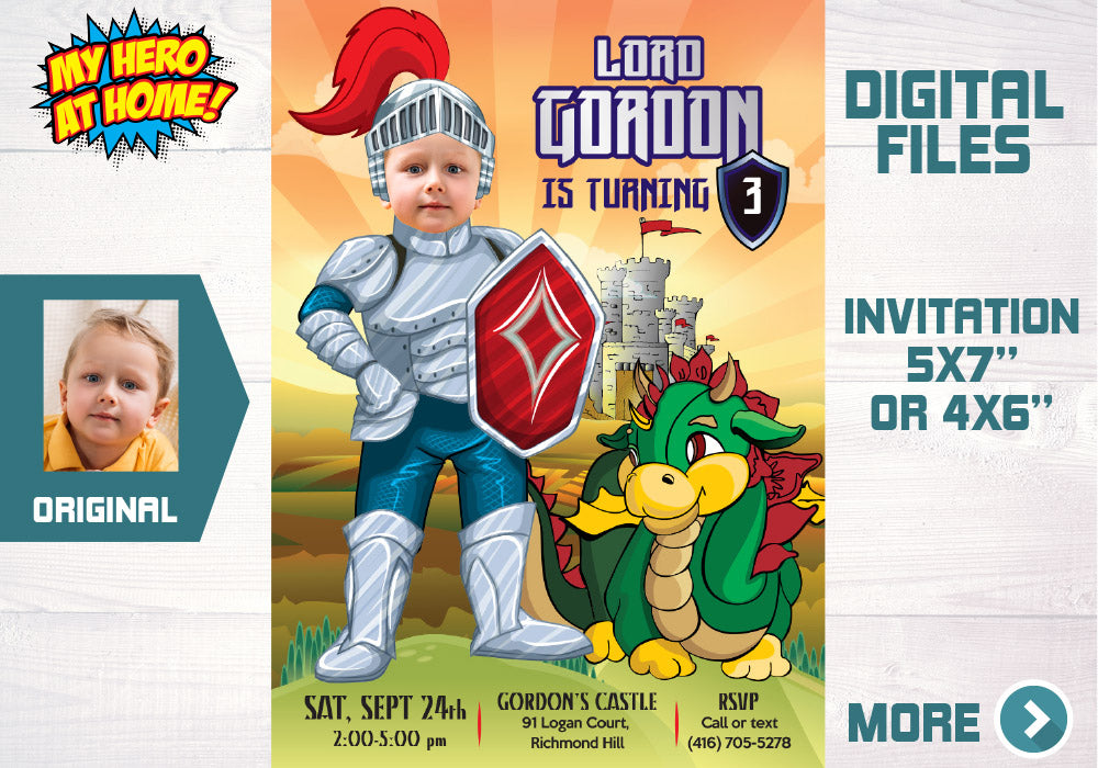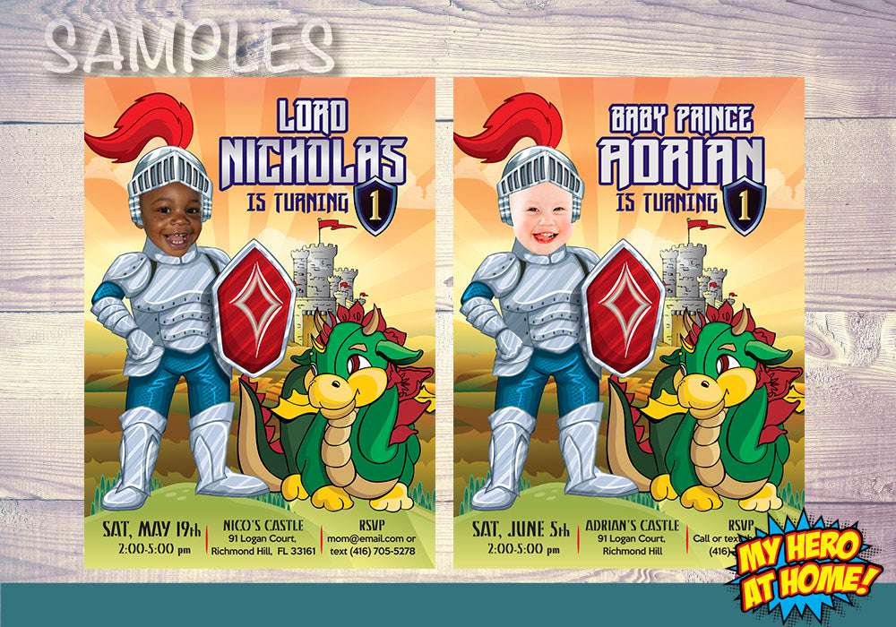 Baby Knight 1st birthday Invitation, Baby Dragon Medieval 1st party invite with photo. 217