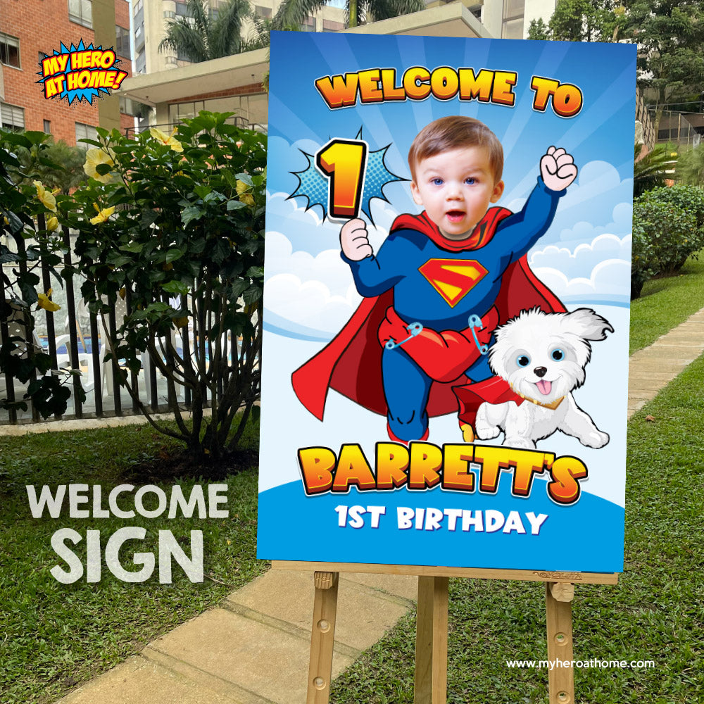 Baby Superman and Krypto Welcome sign with photo, Super baby welcome party, Superman 1st Birthday Sign, Superman and puppy Krypto Party Entrance Print. 2351WS