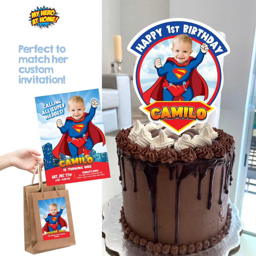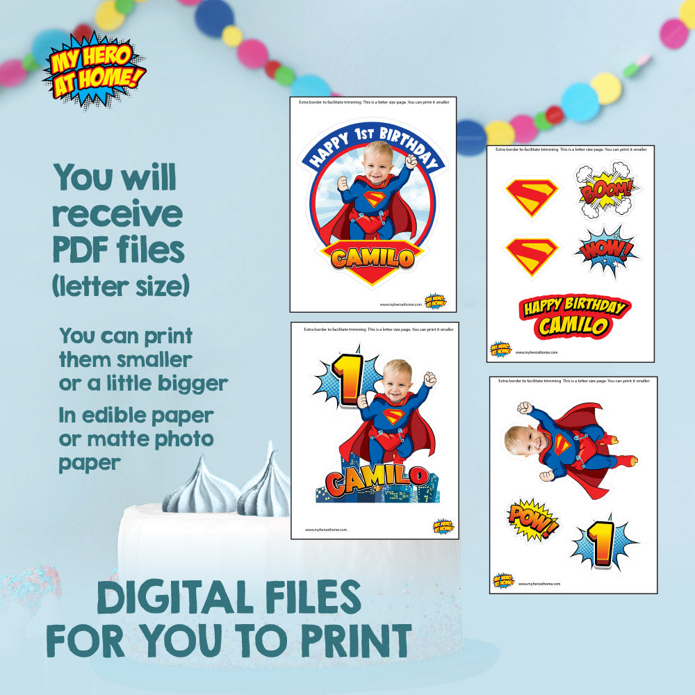 Personalized Cake topper with the photo of your baby as Superman, Superman 1st birthday Cake Ideas, Baby Superman Cake decor, Superman DIY 1st Birthday cake, Printable baby Superman cake decoration, Easy Super baby cake topper, DIY Super baby cake decor.