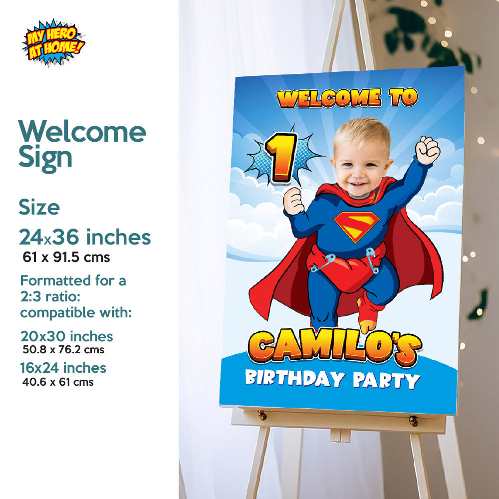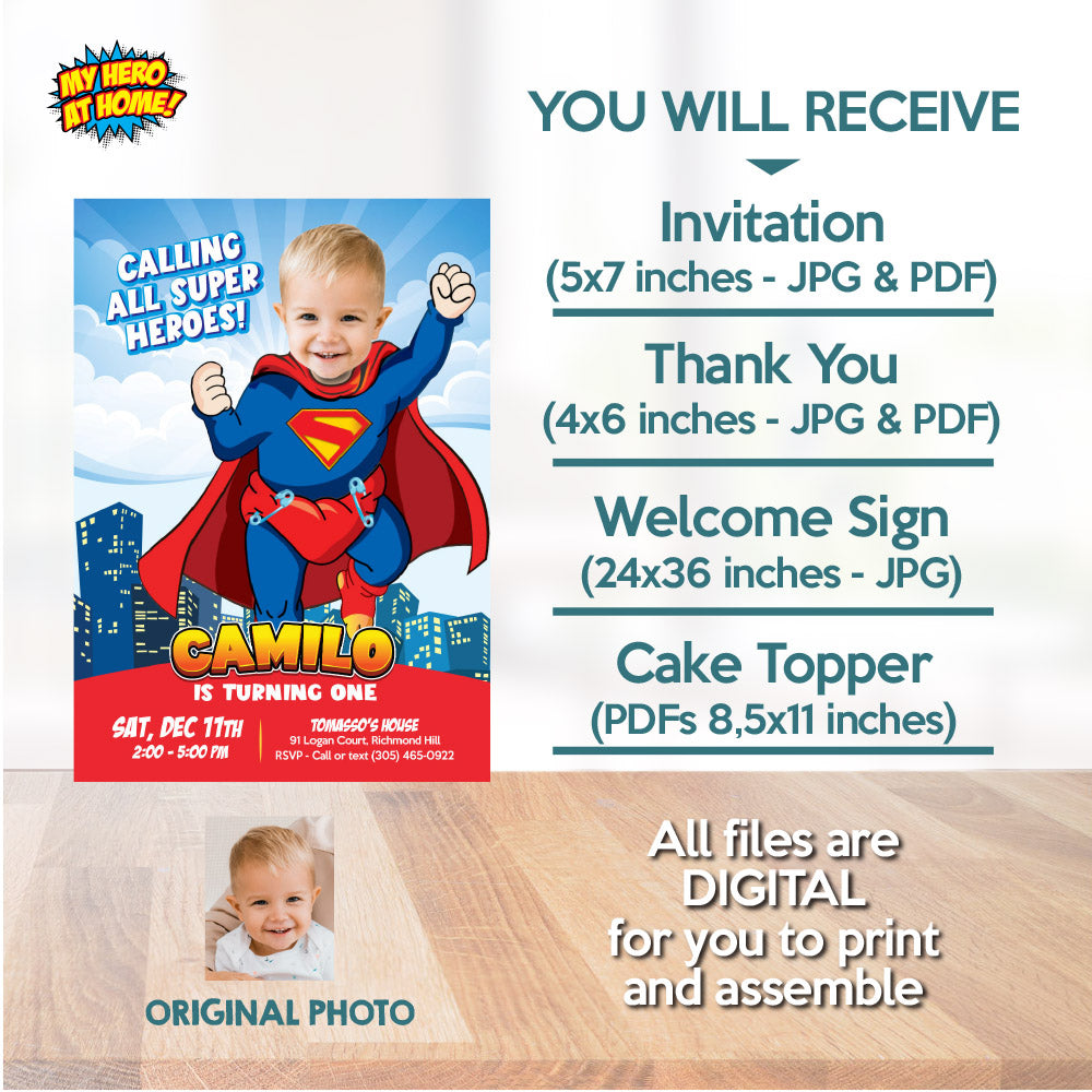 Bundle Baby Superman 1st Birthday, Invitation and Thank you, Cake Topper, Welcome Sign. 2335B2