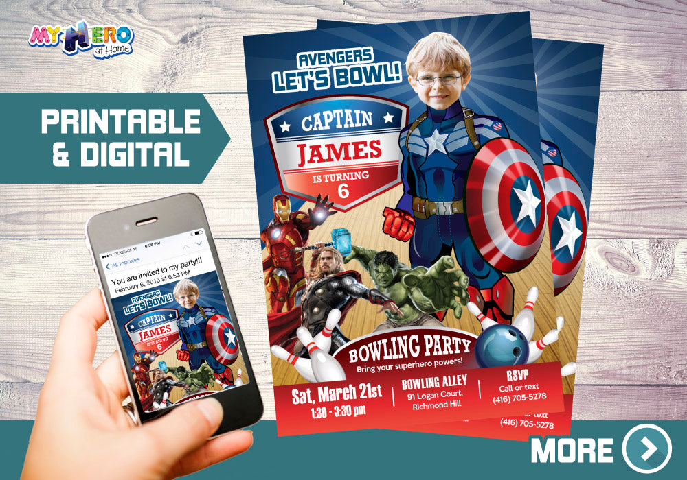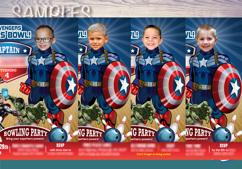 Captain America Bowling Birthday Party Invitation, Capt America photo Invite. 138