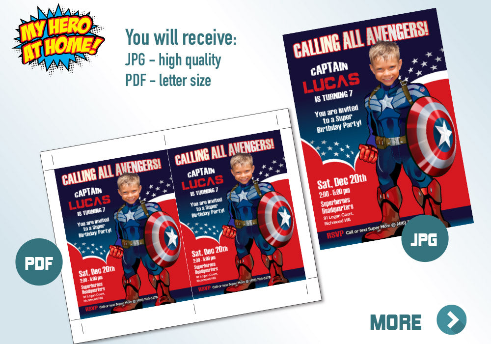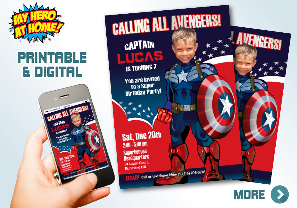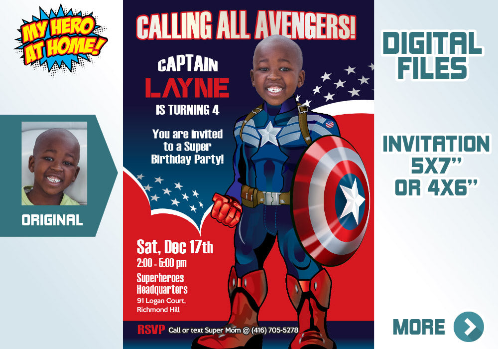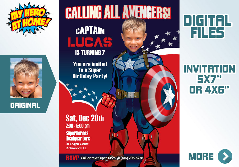 Custom Captain America party photo Invitation, Capt America Birthday Invitation. 074