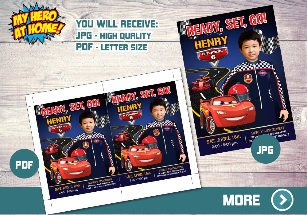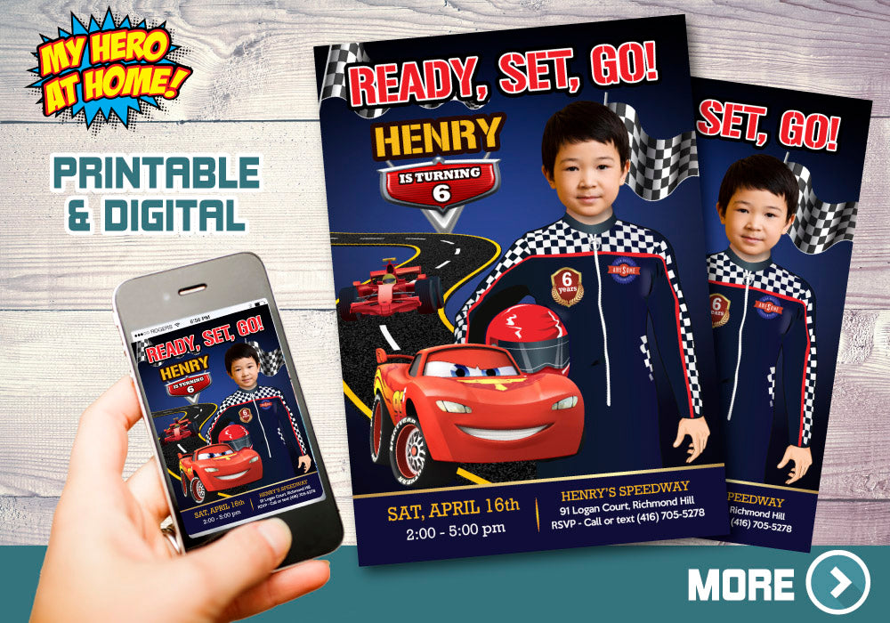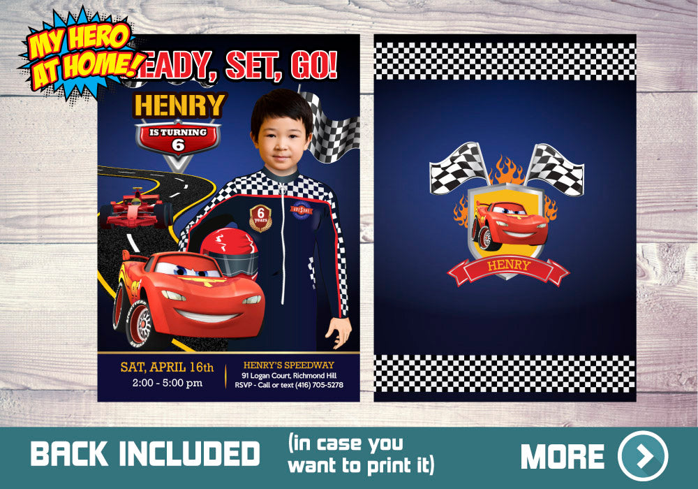 Turn your child into a Race Car Driver to be the star of his custom Race Car Lighting McQueen party invitation, Cars Birthday Invitation, Cars digital invitation, Custom Cars invitation, Cars Photo invitation.