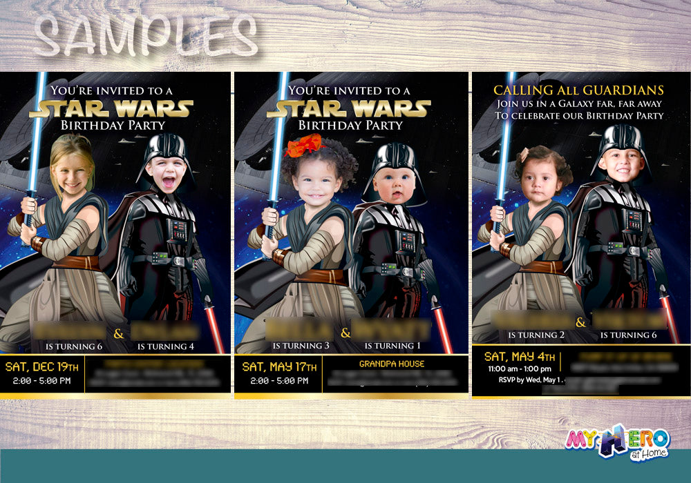 Darth Vader and Jedi Rey birthday invitation with your photos, Star Wars Siblings evite. 040