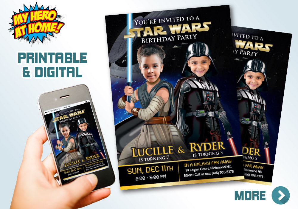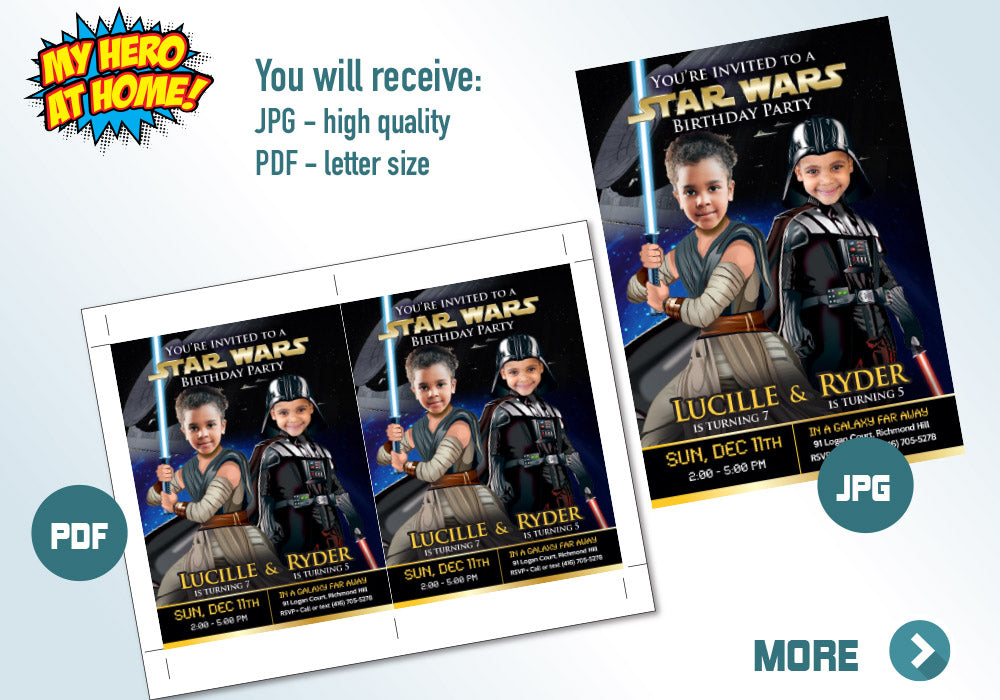 Personalized Joint Star Wars Birthday invite, Joint Darth Vader Jedi Rey Party Invite, Star wars siblings boy and girl party Invite, Siblings Darth Vader and Jedi Rey Party, Joint Star Wars photos template.
