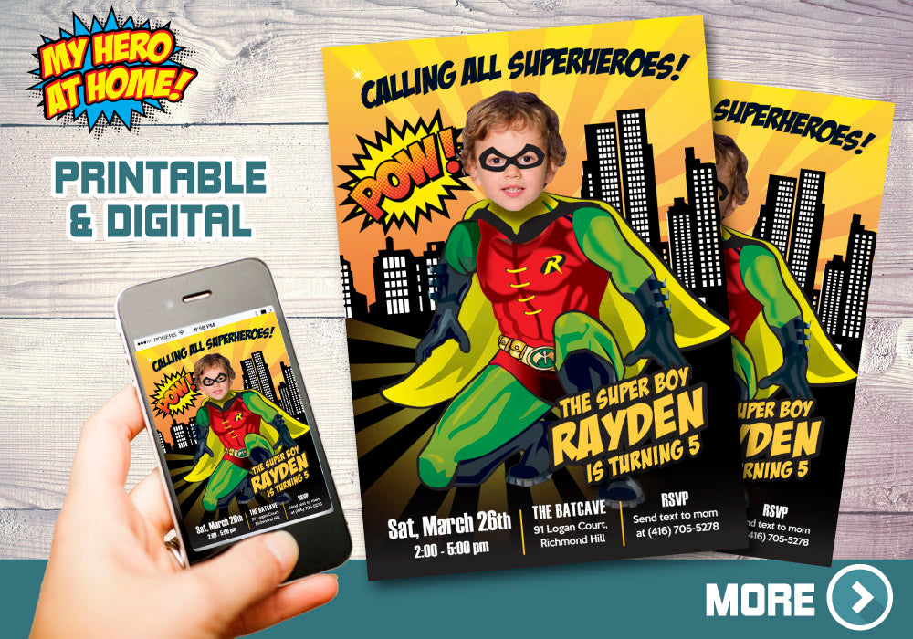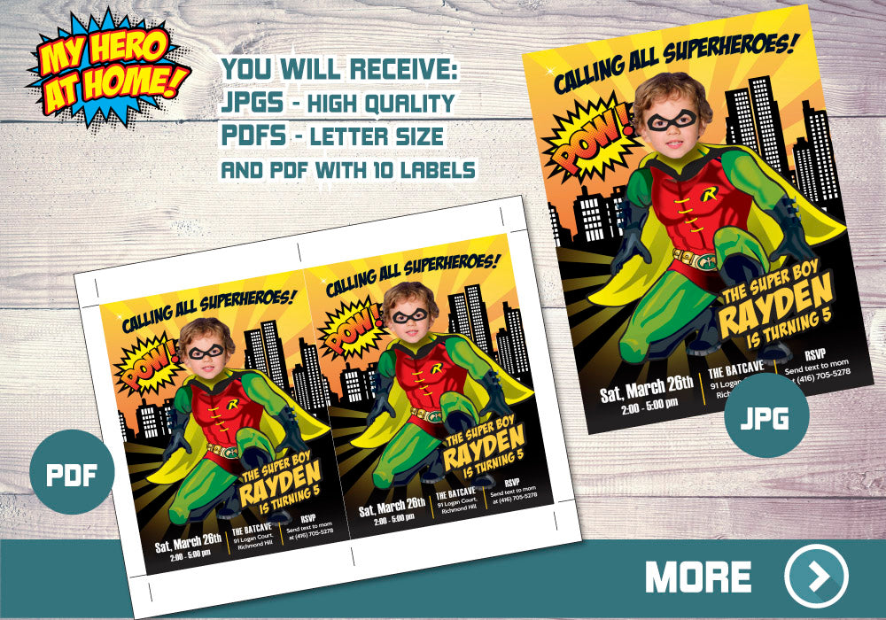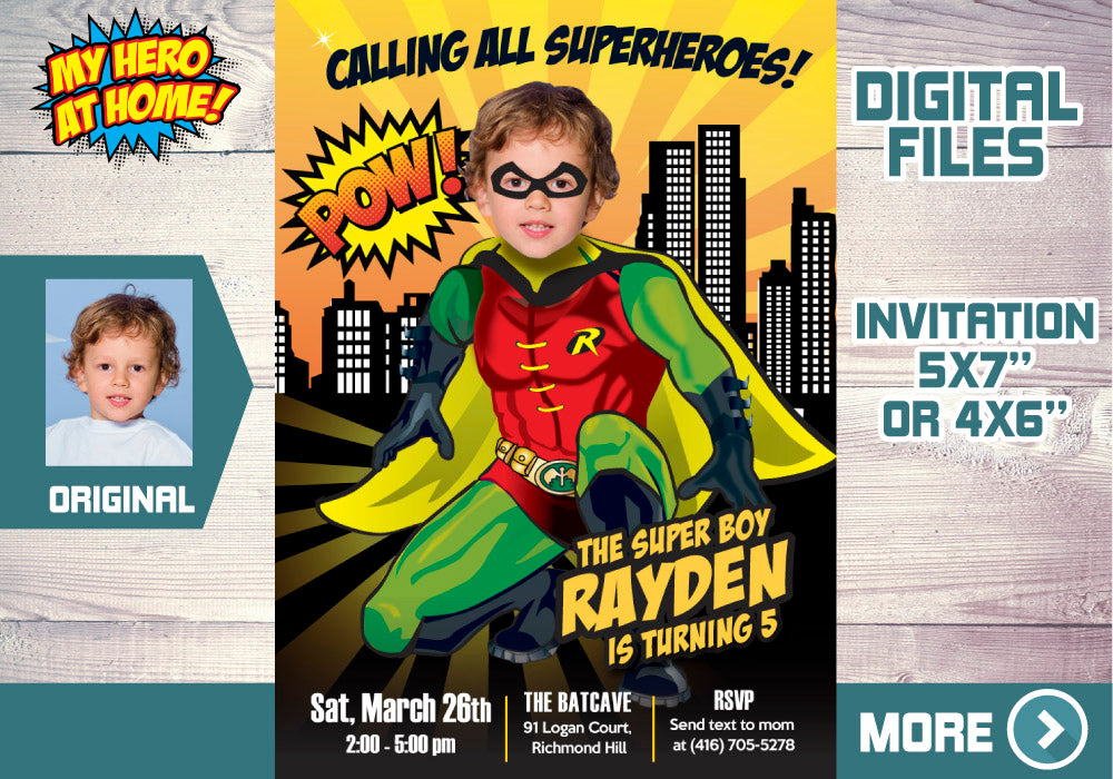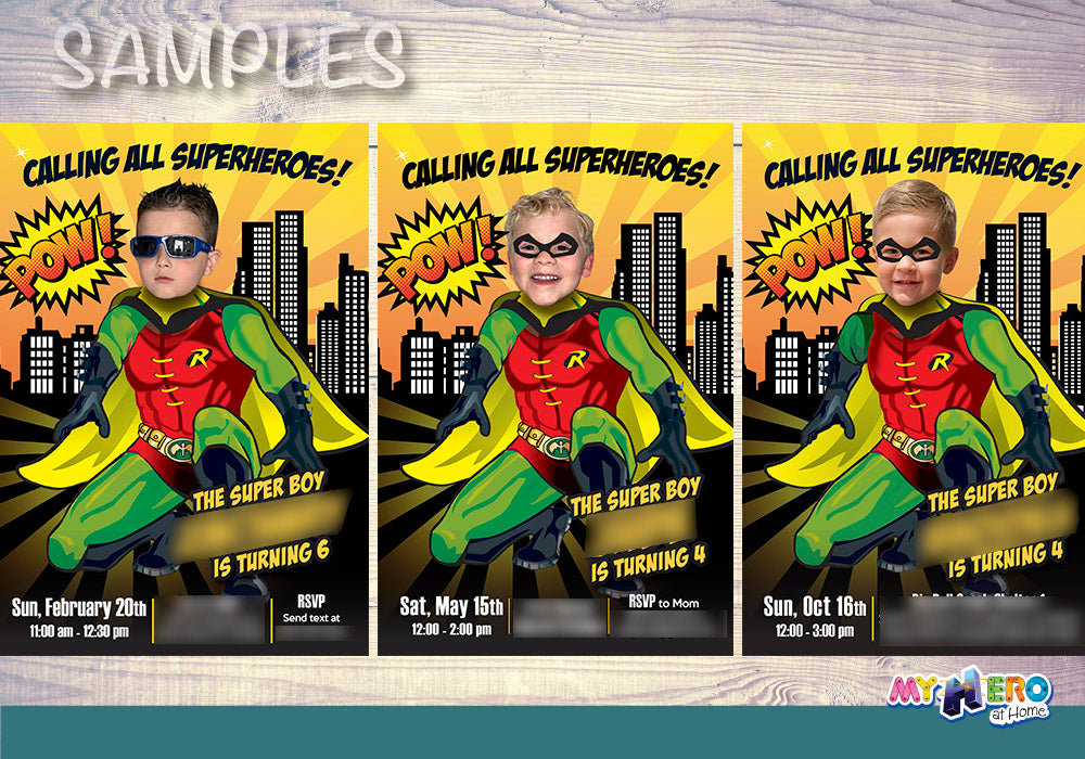 Turn your boy into Robin for his personalized Robin birthday invitation, Robin Party Ideas, Robin Birthday Ideas, Robin Party Invitation, Robin party evite, Robin theme party, Fiesta tema Robin, Invitacion personalizada de Robin.