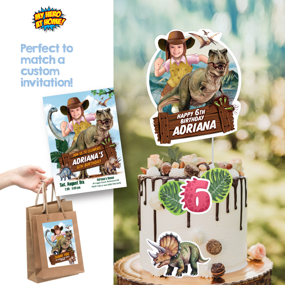Perfect for any Dino Girl-themed party, this personalized cake topper turns your girl into the explorer of their own Jurassic adventure — ideal for a wild birthday celebration full of prehistoric fun!