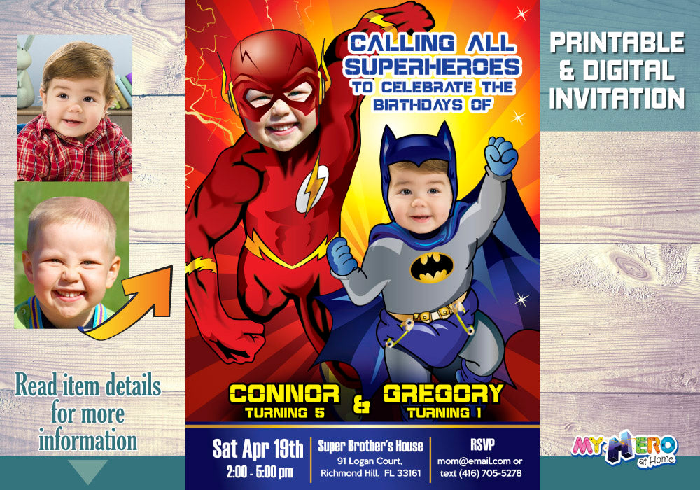 Flash and Batman Siblings Birthday invitation with photos, Batman and Flash party template. 176