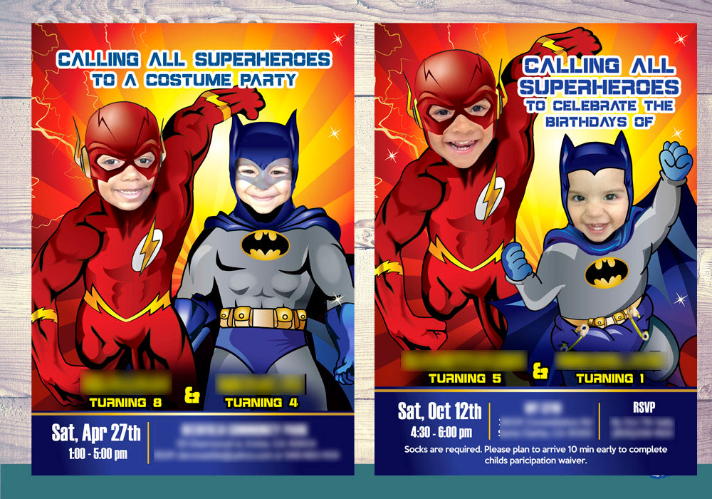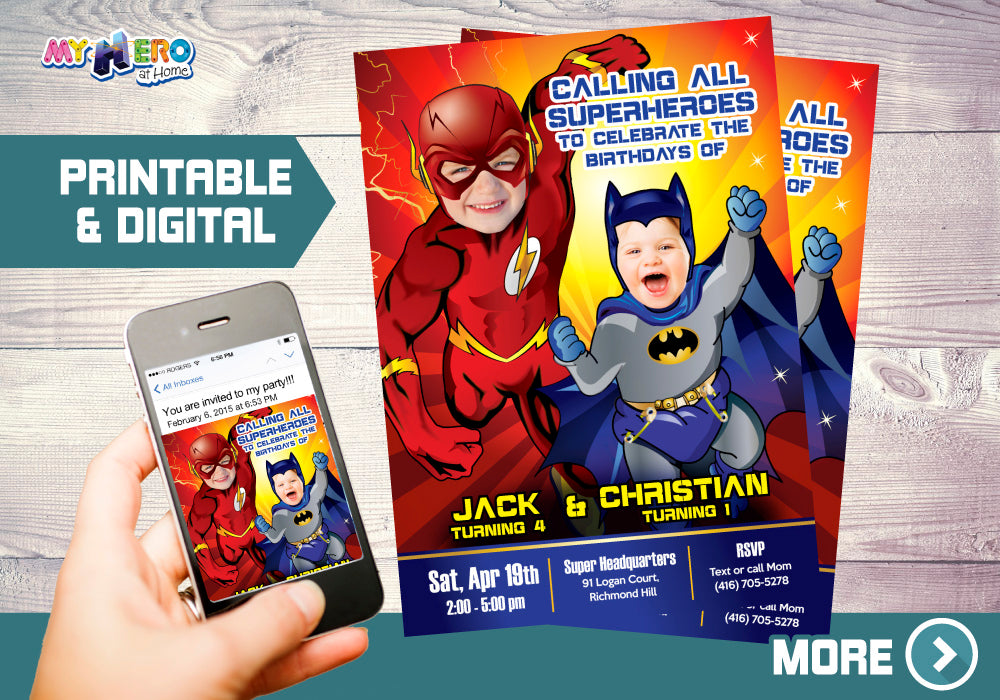 Turn your kids in Flash and Batman for their personalized Joint Batman Flash Invitation, Flash and Batman party invitation, Flash and Batman theme party