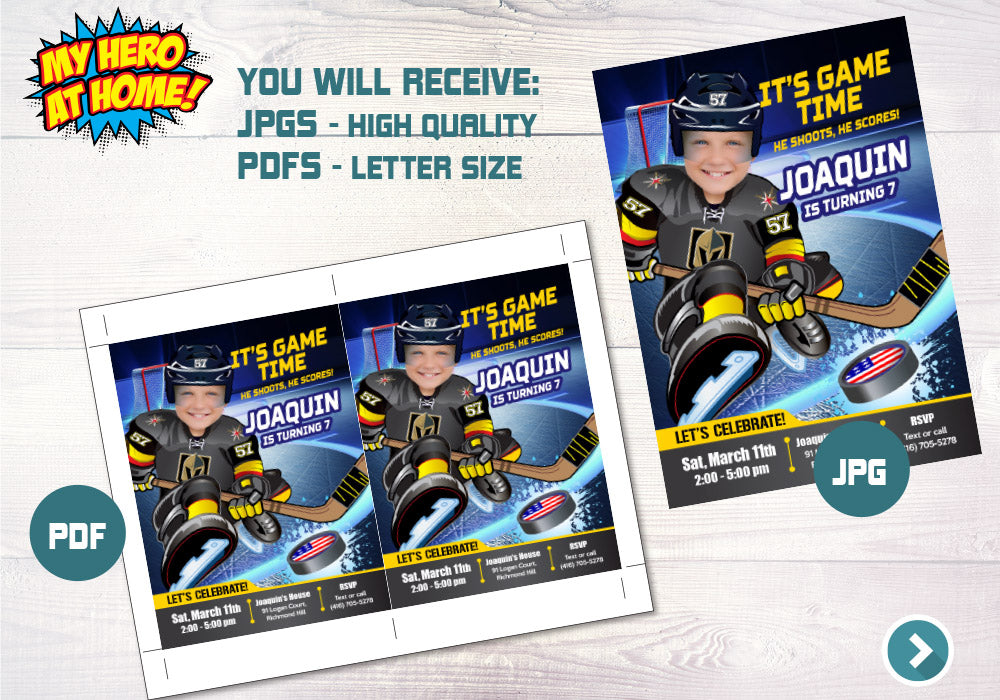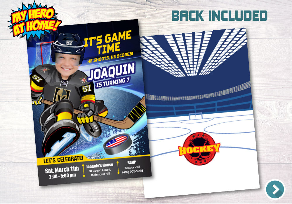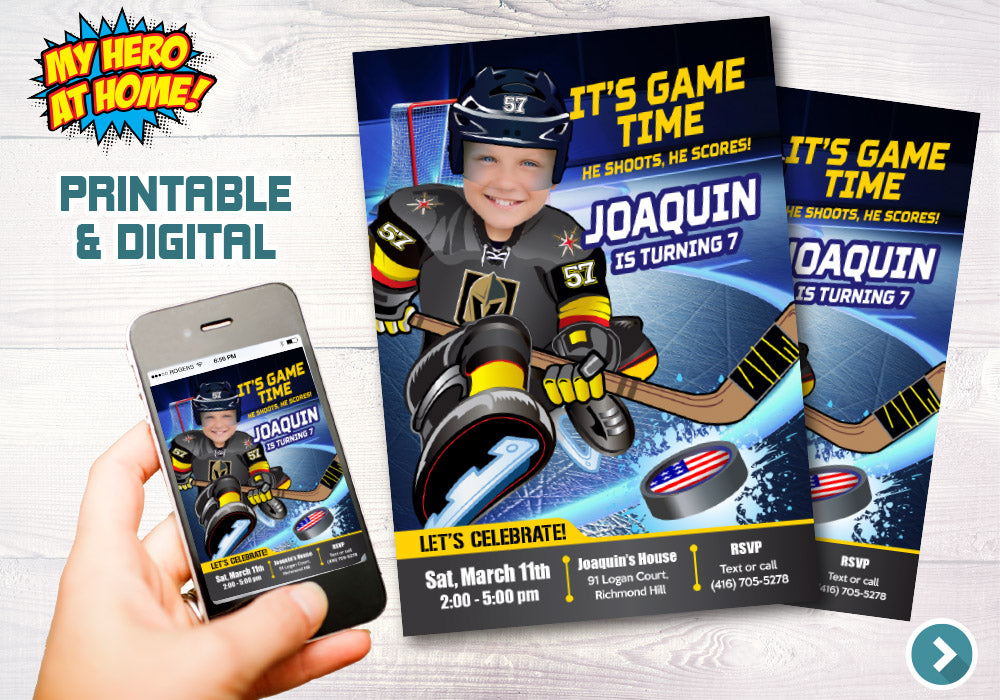 Golden Knights party templates, Kids Golden Knights birthday, Golden Knights birthday invite with photo, Golden Knights Mites digital invite, Hockey Mini Mites Invitation with photo, Custom Squirt Hockey photo invitation, Golden Knights theme kids party.