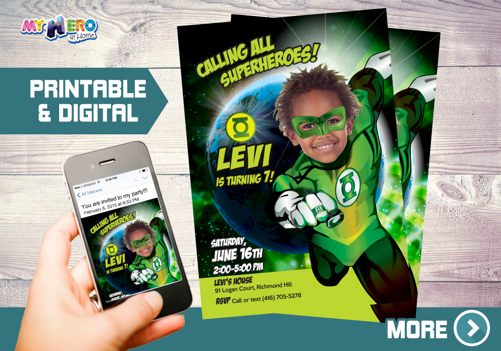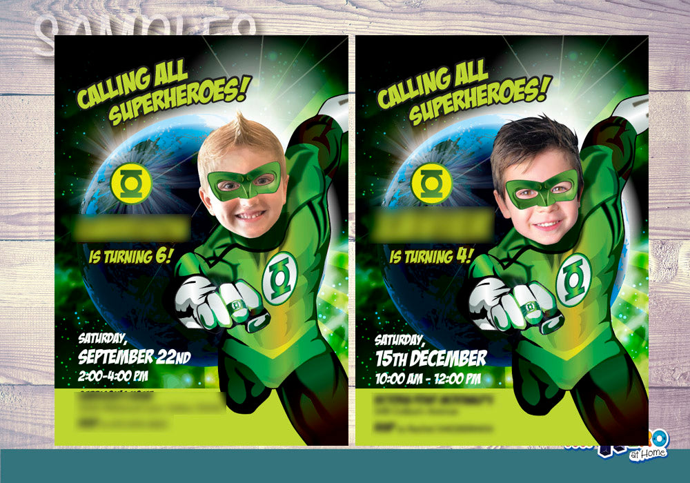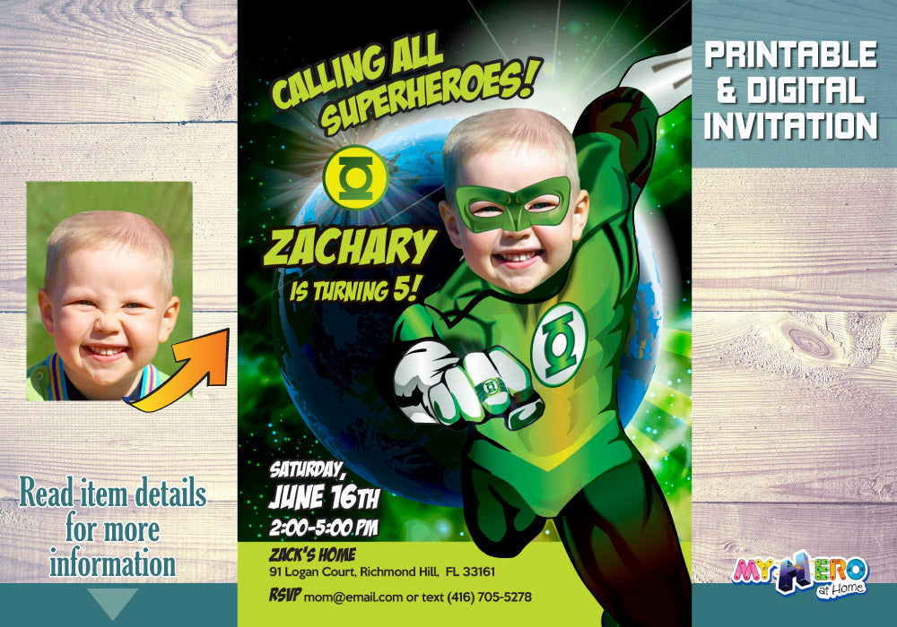 Green Lantern Birthday Invitation with your kid as the star, Green Lantern Photo Invite. 167