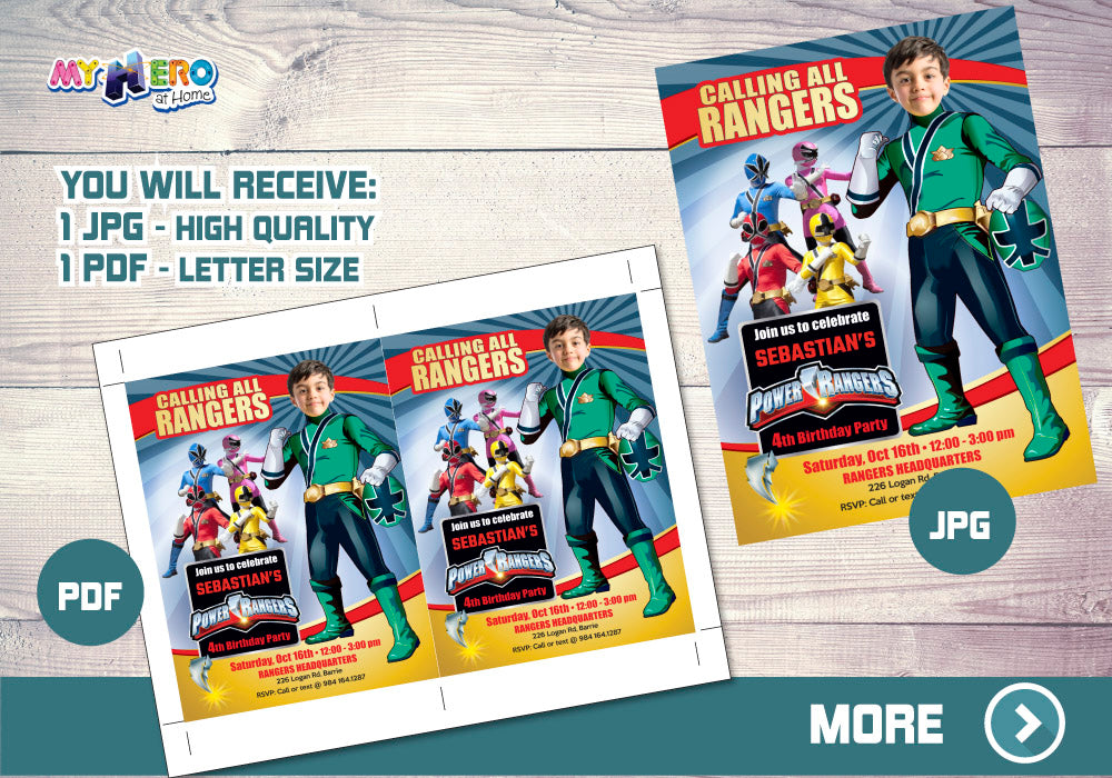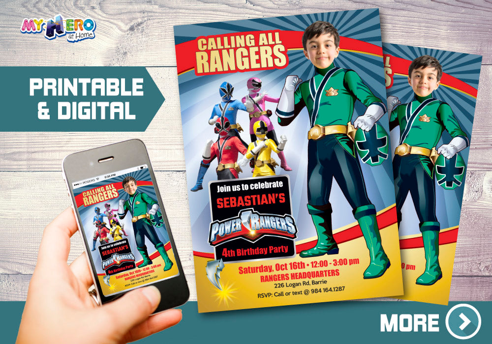 Custom Power Rangers photo Invitation, Green Power Ranger Party Invitation, Power Rangers theme party, Green Power Ranger template, Green Power Ranger invite with photo.