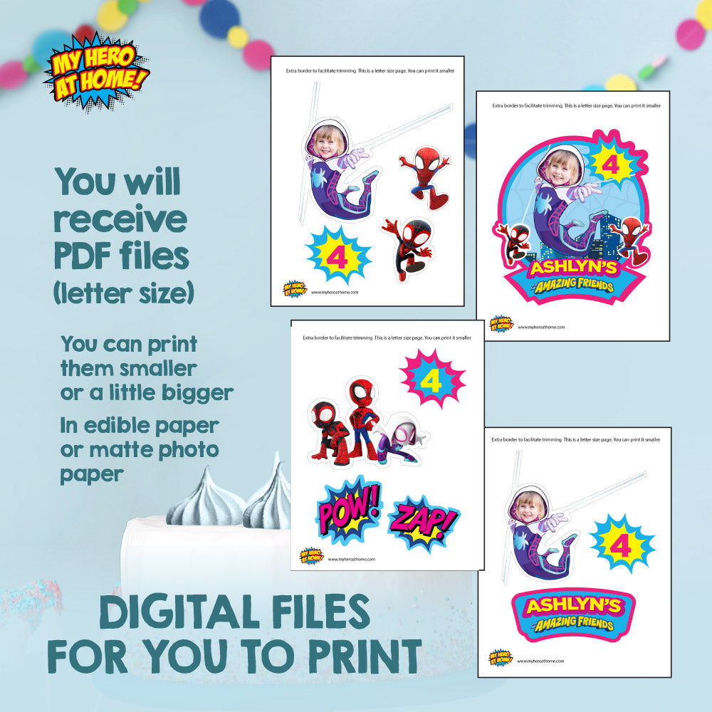 To create an incredible Gwen Stacy Party this set includes Banner / Backdrop of Gwen Stacy with your kid as the star, a customized Welcome sign and an easy to do Cake Topper of Gwen Stacy.