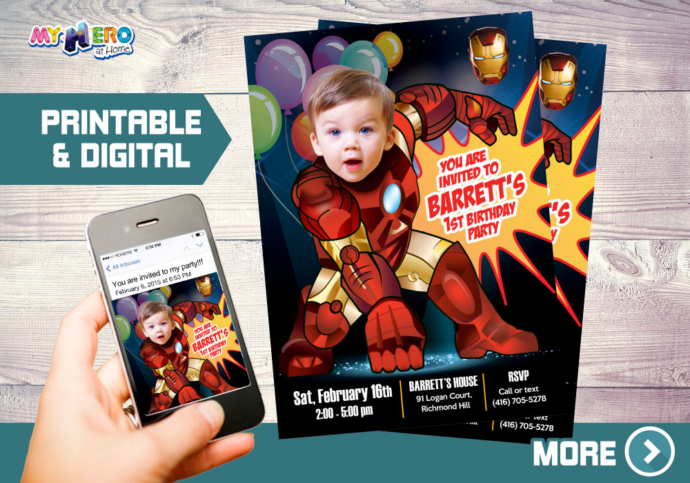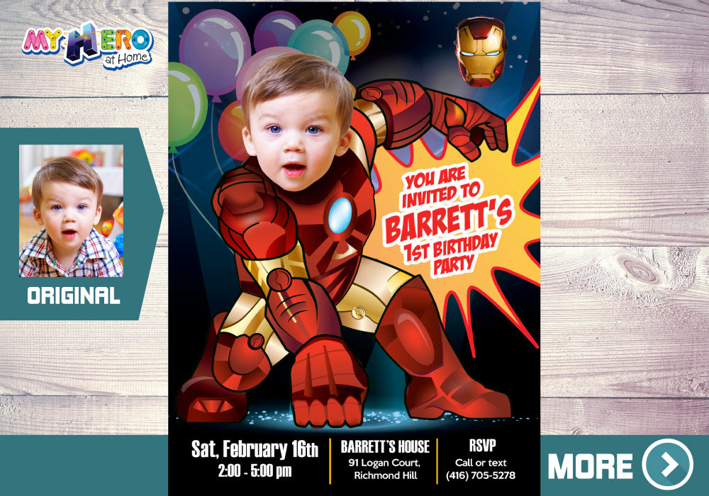 Iron Man 1st Birthday Invitation with your baby as Ironman, Baby Iron Man 1st photo invite. 416