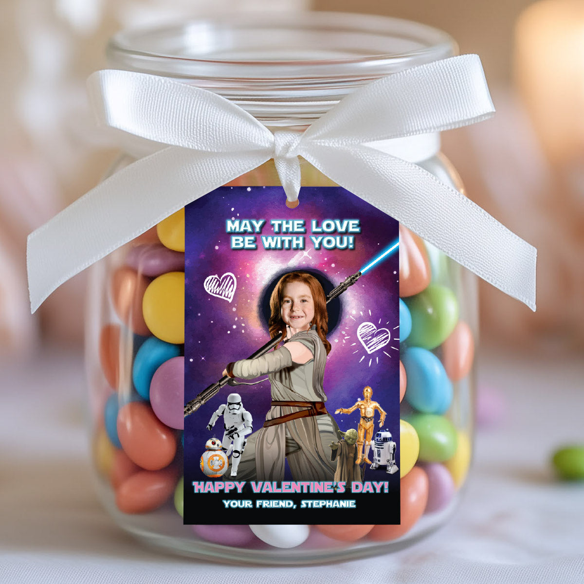Jedi Rey Valentines tags with child as the star, Star Wars Valentine themed cards. 2409