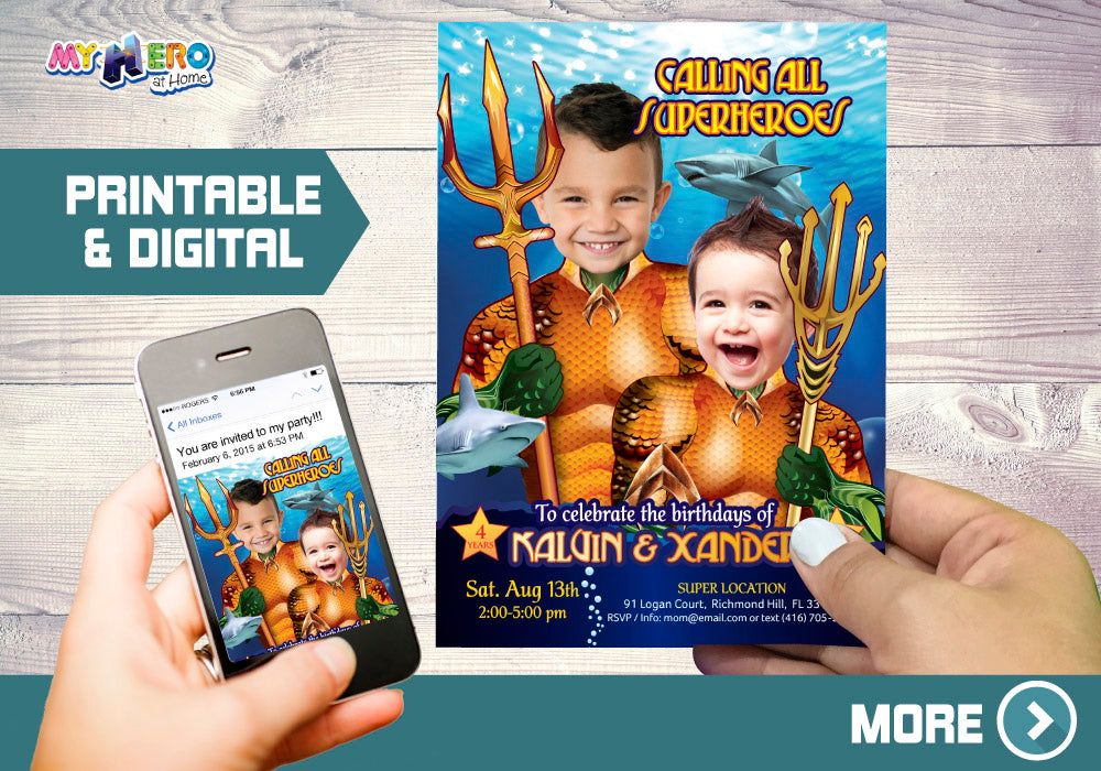 Custom Joint Aquaman Birthday Invitation, Aquaman siblings birthday, Aquaman photo invitation, Aquaman thank you, Aquaman theme party, Joint superheroes party, Superheroes siblings party, Heroes siblings birthday, Joint super heroes digital invitation.