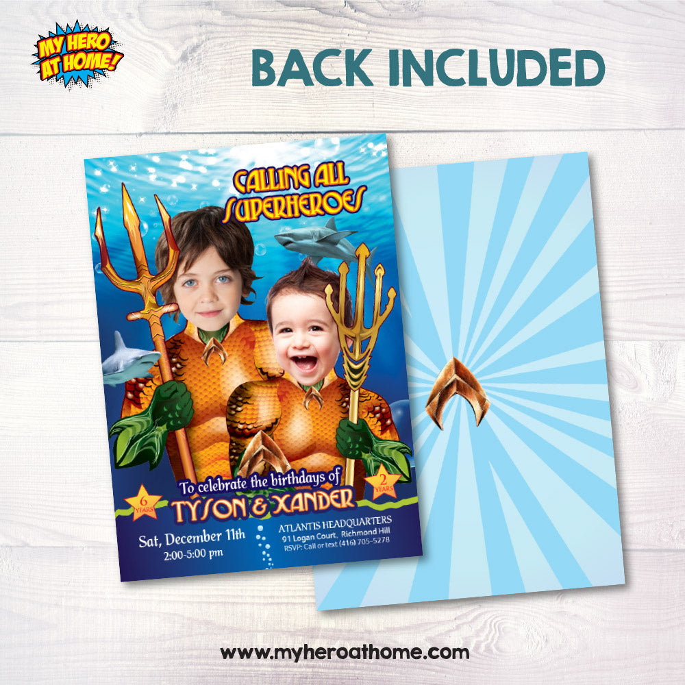 Custom Joint Aquaman Birthday Invitation with photos, Aquaman siblings birthday with birthday boys as Aquaman, Aquaman photos invitation, Aquaman Twins birthday template, Joint superheroes party, Superheroes siblings party, Heroes siblings birthday, Joint super heroes digital invitation.