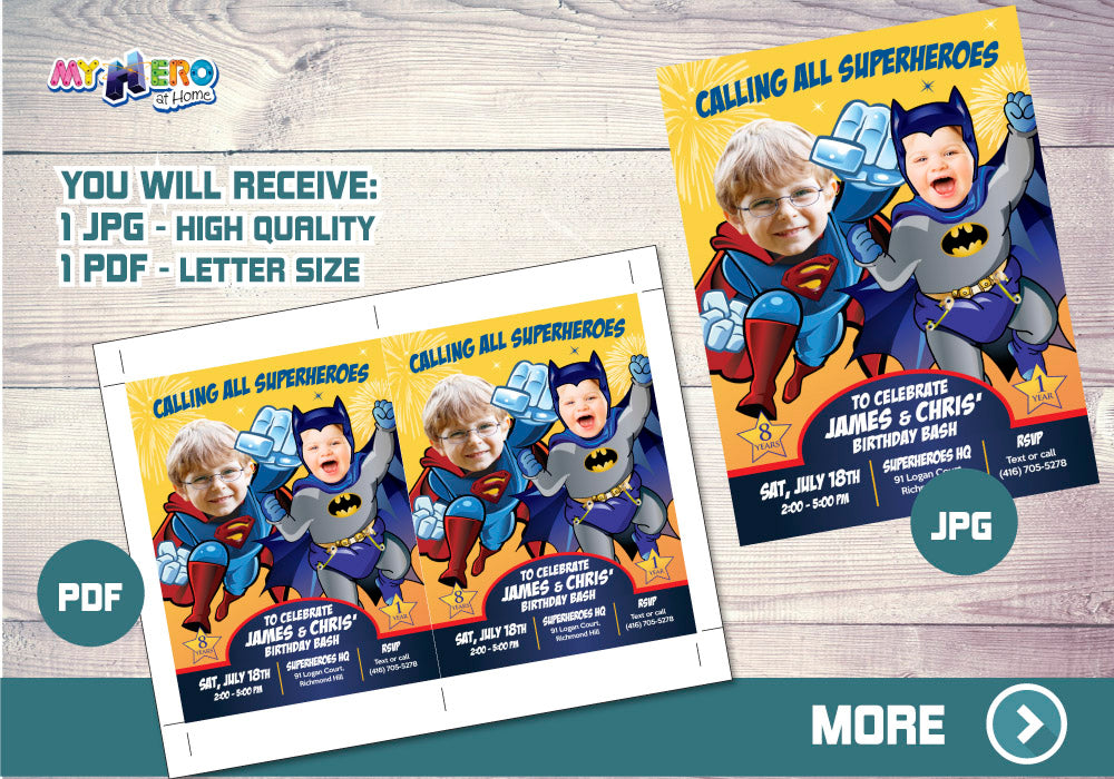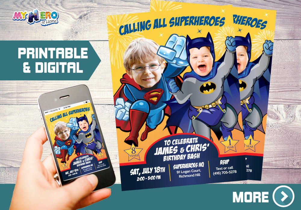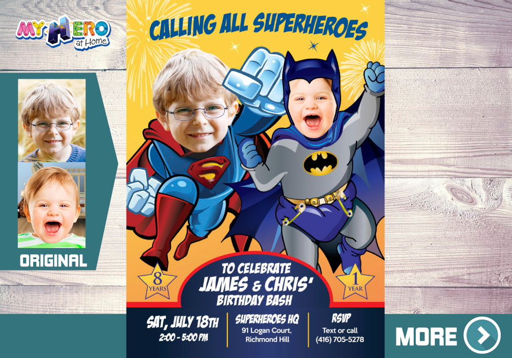 Turn your kids in Superman and Baby Batman for their custom Joint Superheroes Invitation, Superman and Batman party invitation, Superman and Baby Batman theme party, Superheros siblings party.