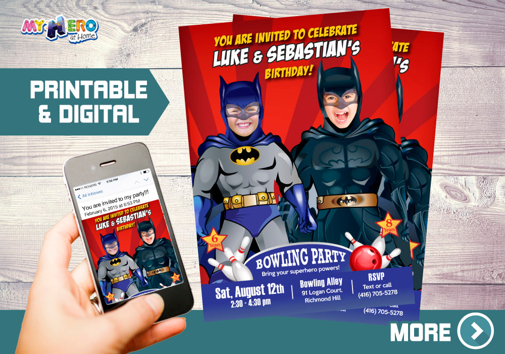 Joint Batman Bowling Party Invitation, Batman Bowling Party, Batman Siblings invite. 199
