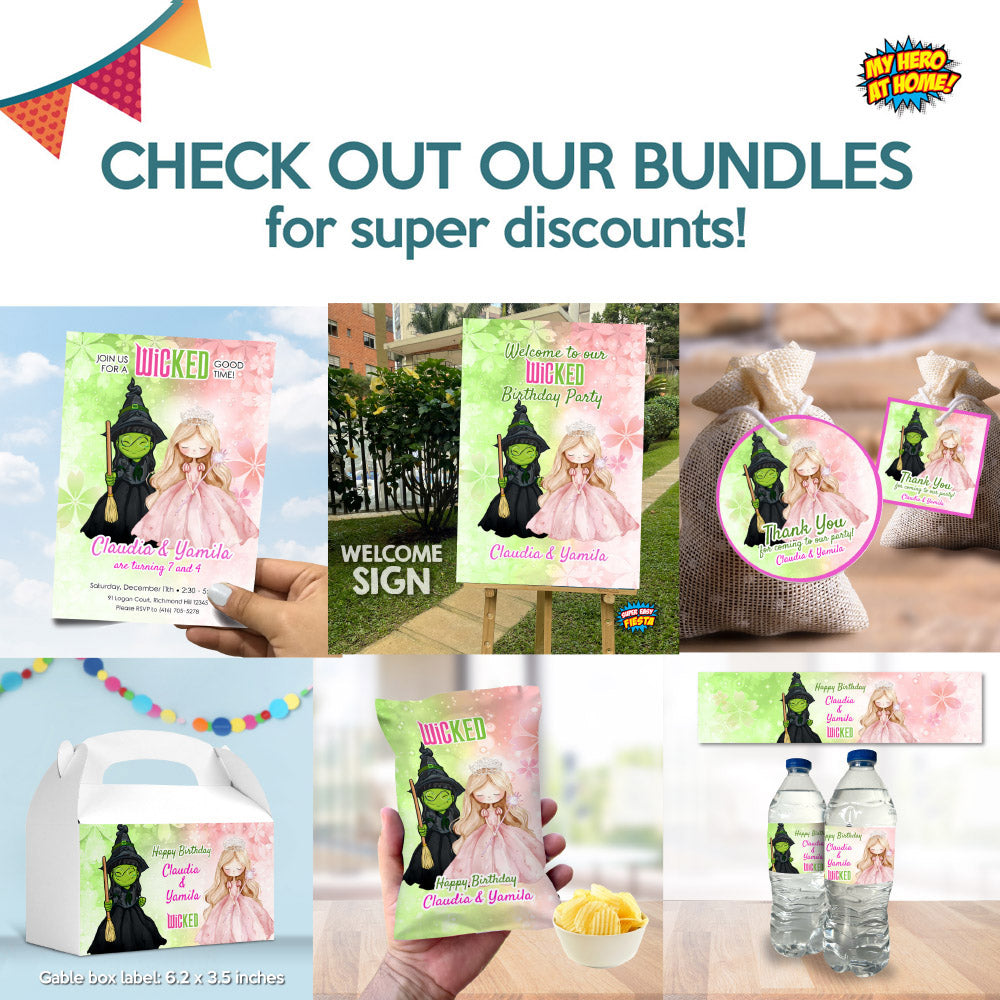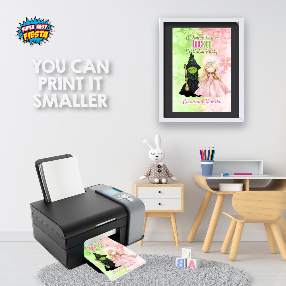 Welcome your guests with a touch of Oz magic! This pink & green watercolor Wicked welcome sign featuring cute Elphaba and Glinda sets the perfect tone for your magical celebration.