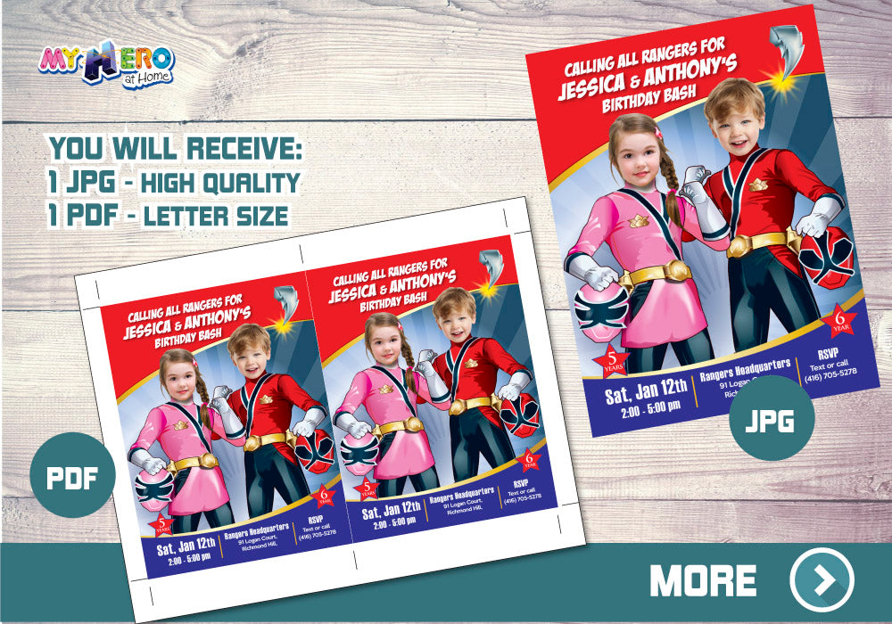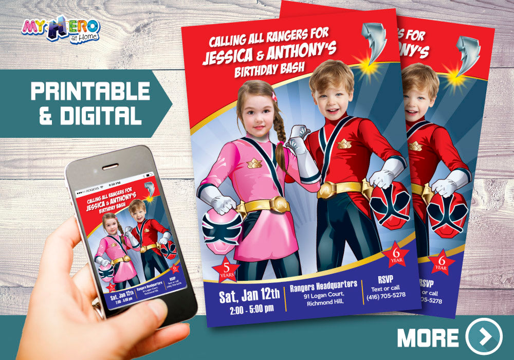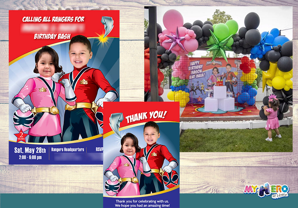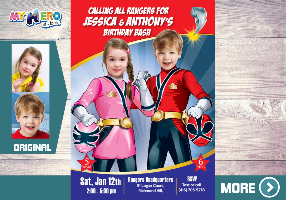 Custom Joint Power Rangers Invitation with photos, Power Rangers photos invitation, Power Rangers birthday themed, Power Rangers siblings party, Power Rangers siblings invite, Power Rangers girl and boy party, Rangers theme party.