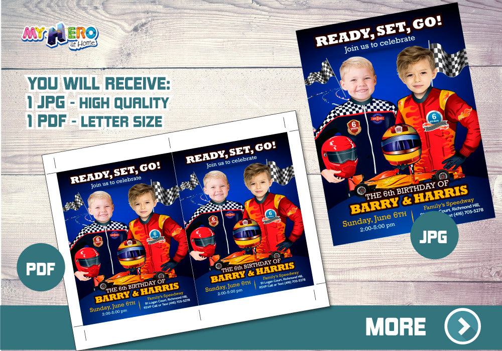 Joint Race Car birthday Invitation with 2 boys, Siblings Race Car Party template. 316