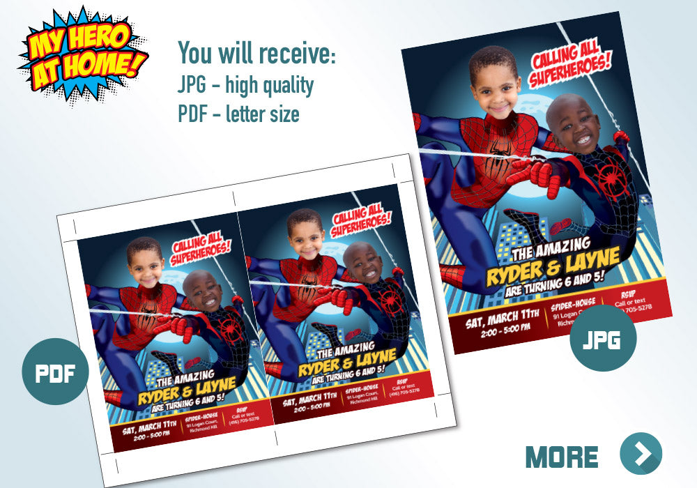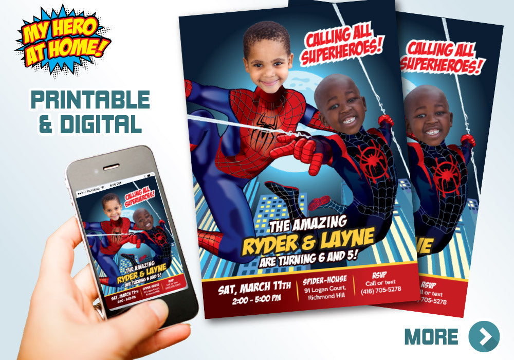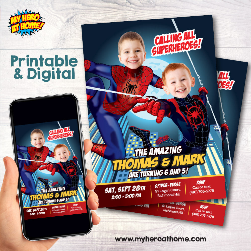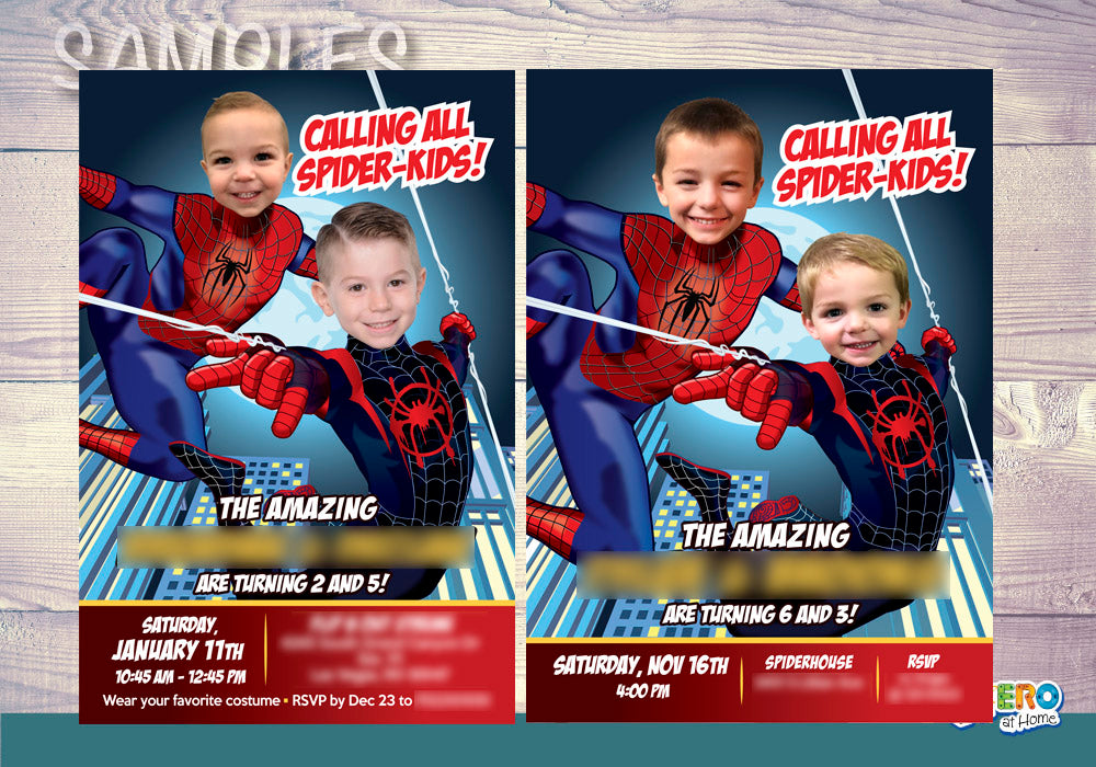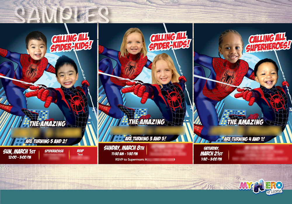 Custom Joint Spiderman Invitation with photos, Personalized Joint Spiderman Invitation, Custom Joint Spiderman theme party, Joint spiderman miles Morales pool party, Joint spiderman bowling party, Spiderman Miles Morales siblings invitation.