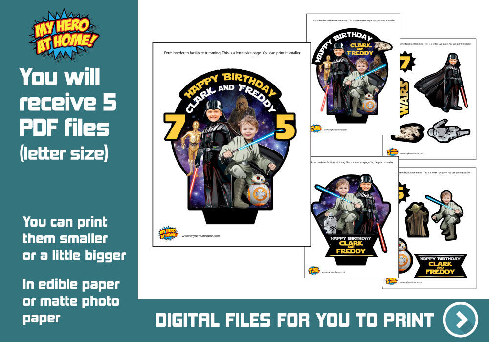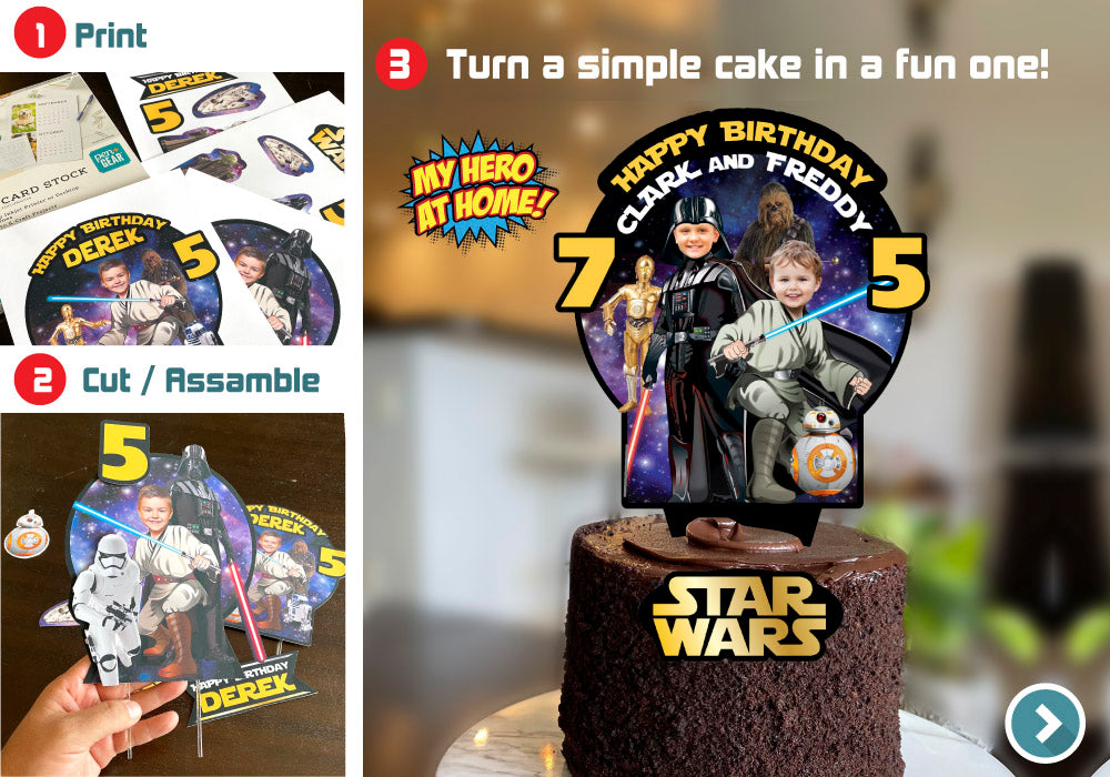 Turn your children in a Jedi and Darth Vader to star his unique Joint Star Wars Cake topper! Star Wars Cake Siblings Ideas, Star Wars Siblings Cake decoration, Joint Star Wars DIY cake, Jedi and Darth Vader cake topper, Jedi and Darth Vader Cake decoration.