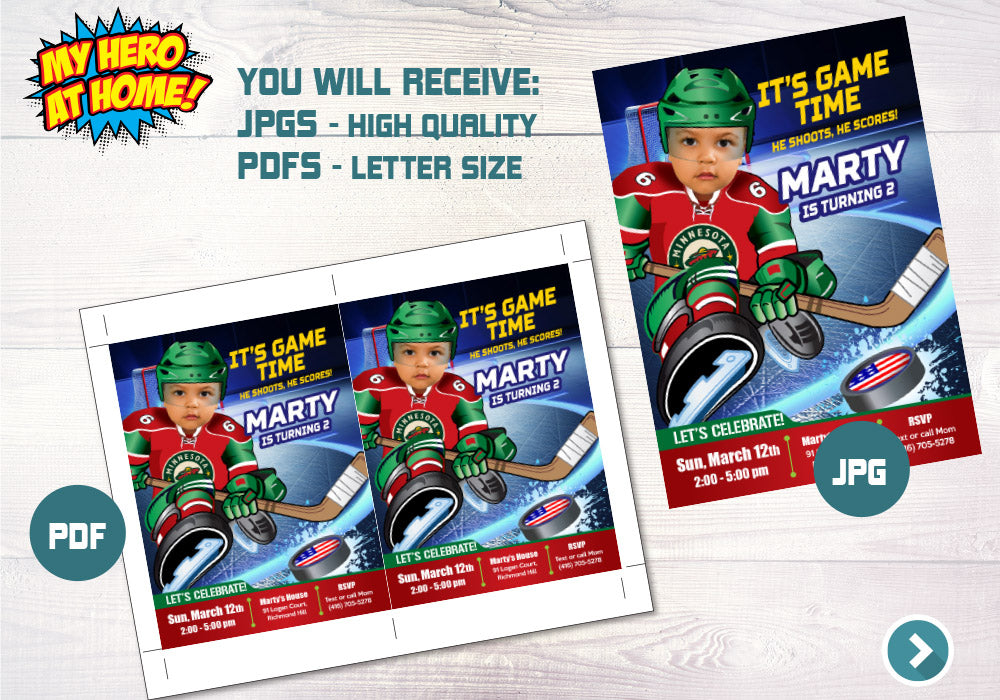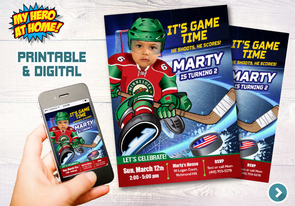 Minnesota Wild Mites digital invite, Hockey Mini Mites Invitation with photo, Custom Squirt Hockey photo invitation, Minnesota Wild theme kids party, Minnesota Wild party templates, Kids Minnesota Wild birthday, Minnesota Wild birthday invite with photo.