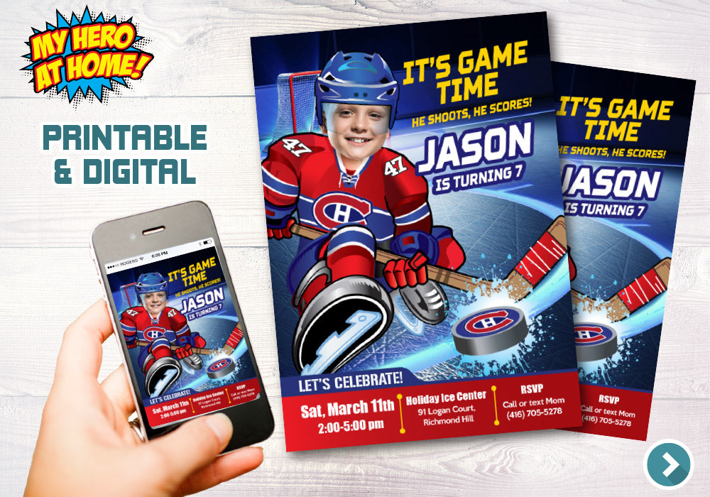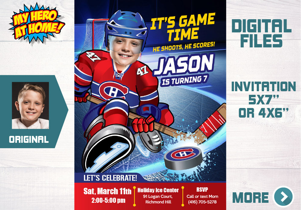 Montreal Canadiens party templates, Children Montreal Canadiens birthday, Canadiens birthday invite with photo, Canadiens digital invite, Hockey Invitation with photo, Custom Hockey photo invitation.
