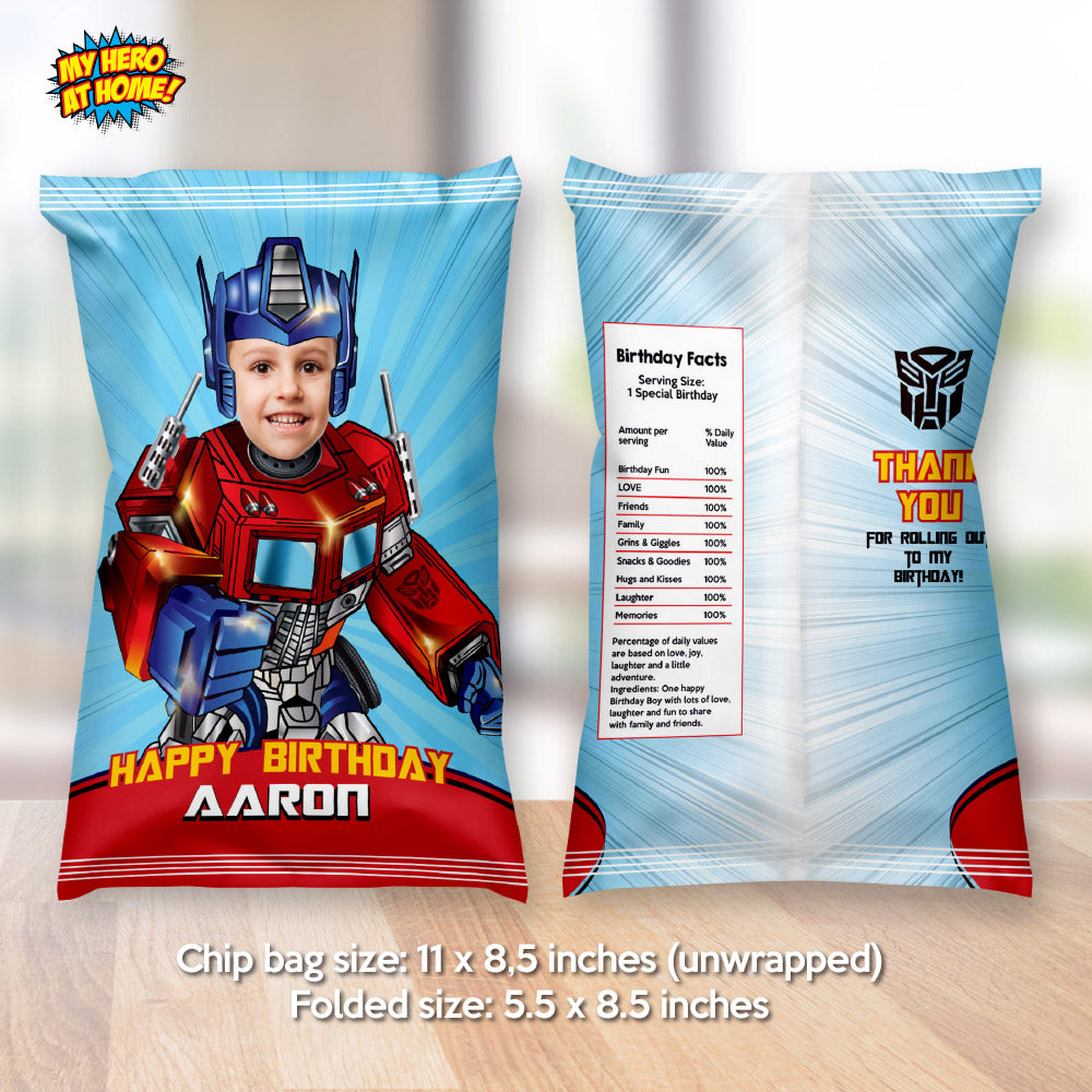 Personalized Optimus Prime Chip bag wrapper with photo, Optimus Prime Party decoration ideas, Optimus Prime Birthday ideas, Optimus Prime party favors, Optimus Prime theme party, Autobots chip bag wrapper, Autobots party goodies, Autobots party ideas, Transformers Uno birthday ideas, Transformers Uno party