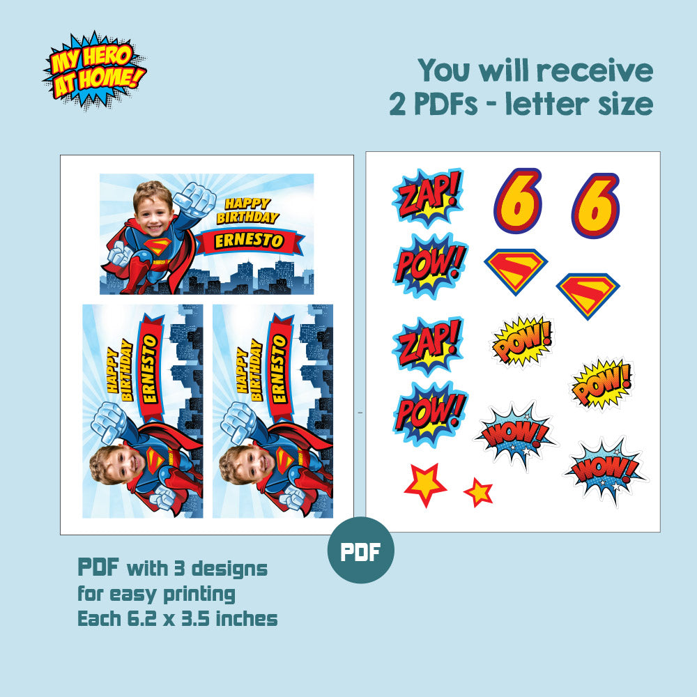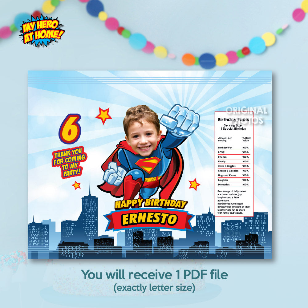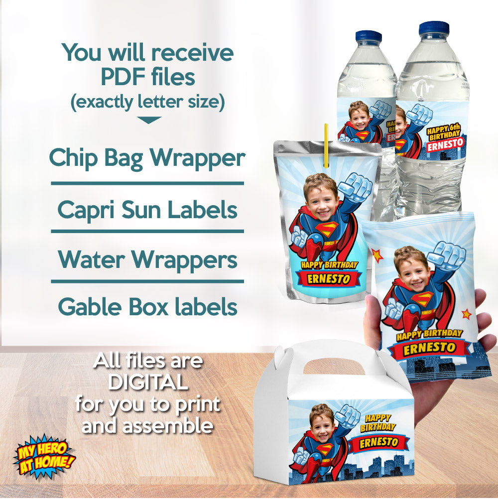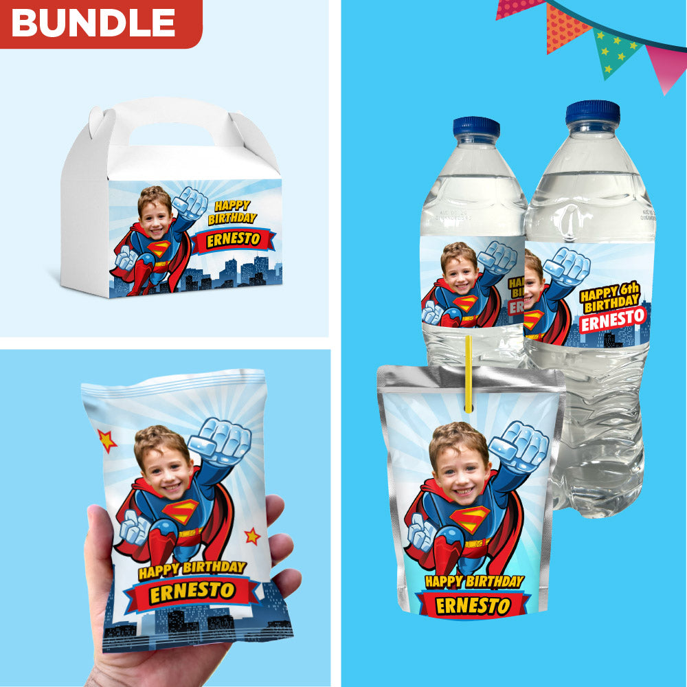 This bundle includes personalized with your kid as his favorite superhero, Superman kid water bottle wrappers, Superman kid capri sun pouches, Superman kid box gable and Superman kid chip bags, Bundle Superman kid Snacks labels, Personalized Superman kid Party snacks
