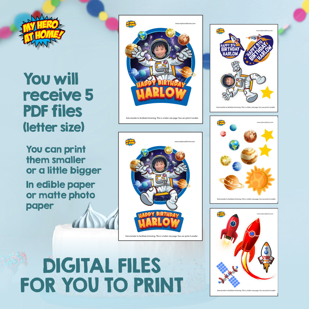 Printable Astronaut Cake Ideas, Outer Space cake topper with photo, Outer Space cake decor, Milky way cake topper with birthday kid as the star, Astronaut Birthday cake, Astronaut DIY cake, Outer Space party cake, Outer Space cake decor, Planets cake topper ideas.