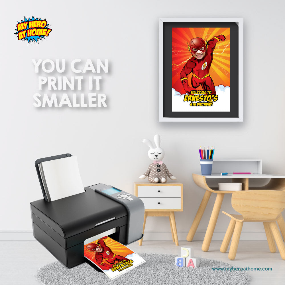 Welcome your guests in super style with this personalized Flash welcome sign, featuring your child as the fastest superhero alive! Perfect for placing at the entrance, near the dessert table, or anywhere you want to make a heroic first impression!