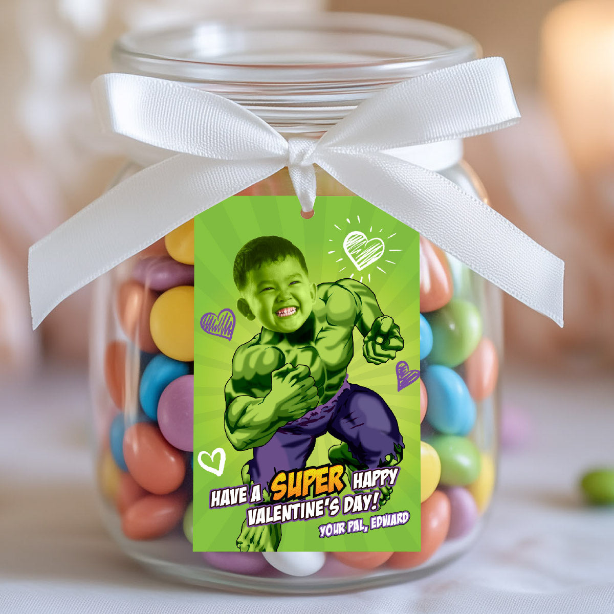 Personalized Hulk Valentines tags with child as the star, Valentine Hulk themed cards. 2399