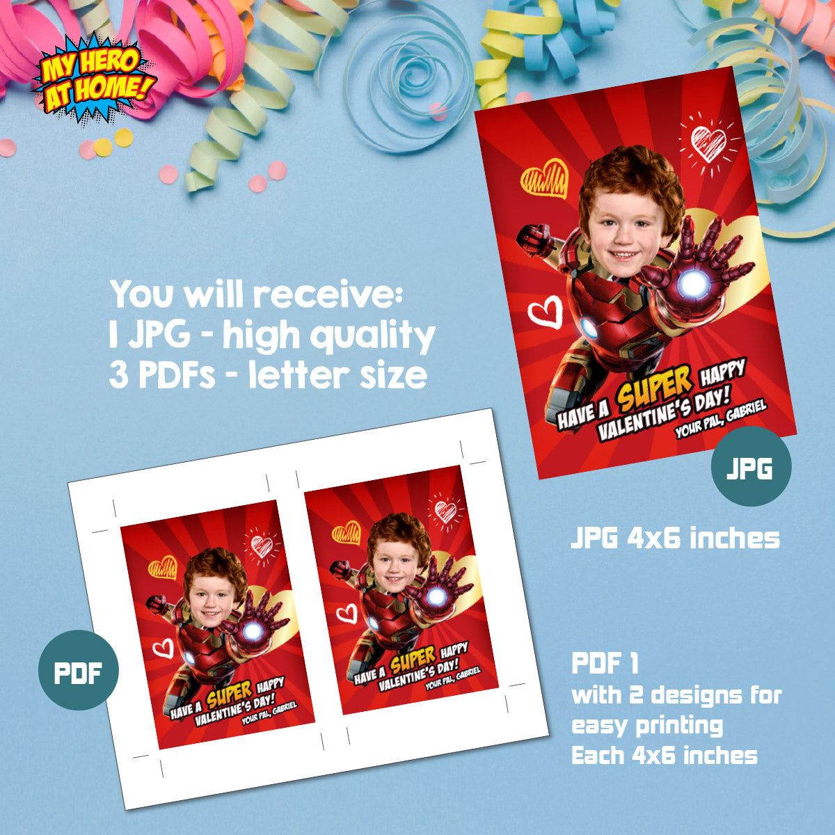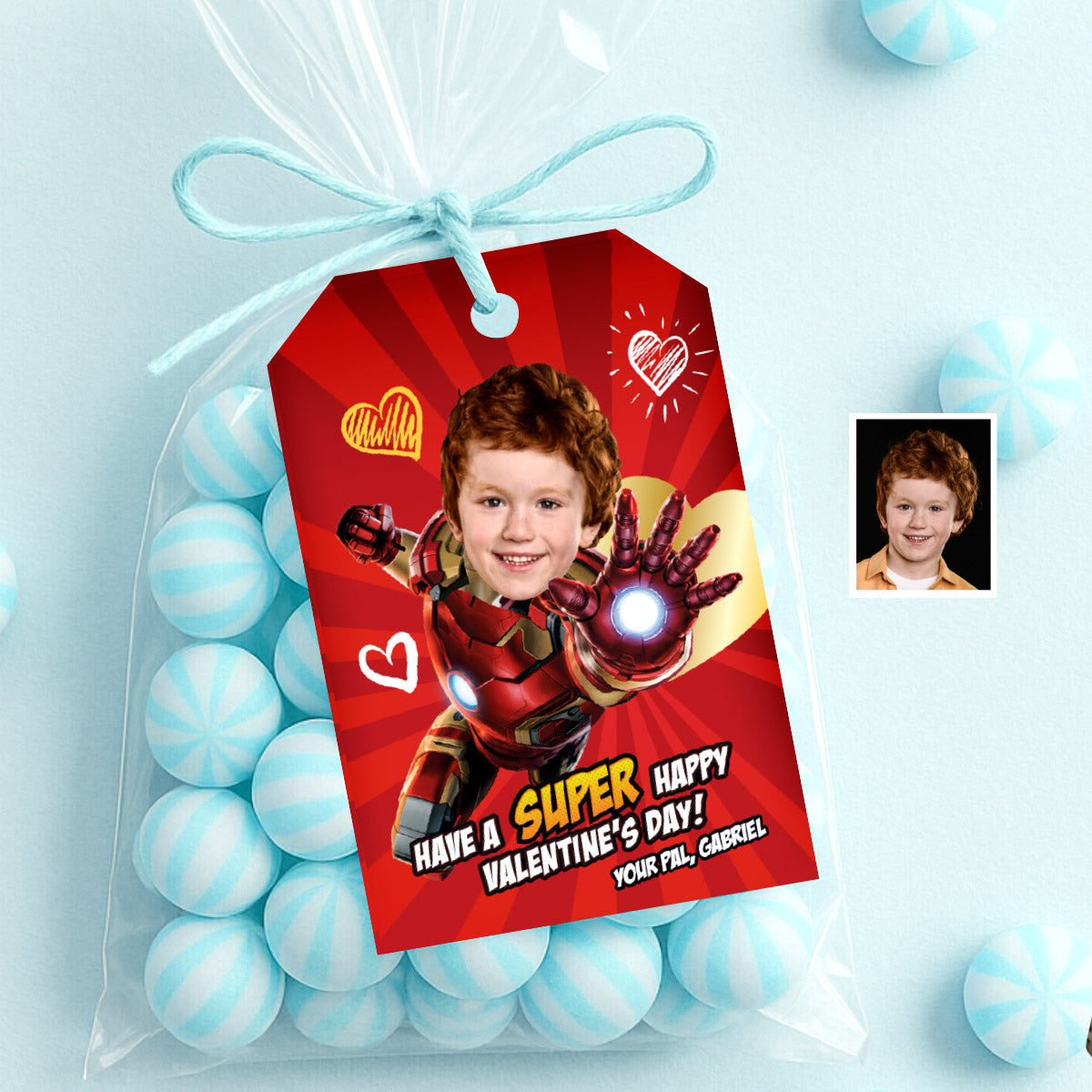 Personalized Ironman Valentines tags with child as the star, Valentine Ironman themed cards. 2401