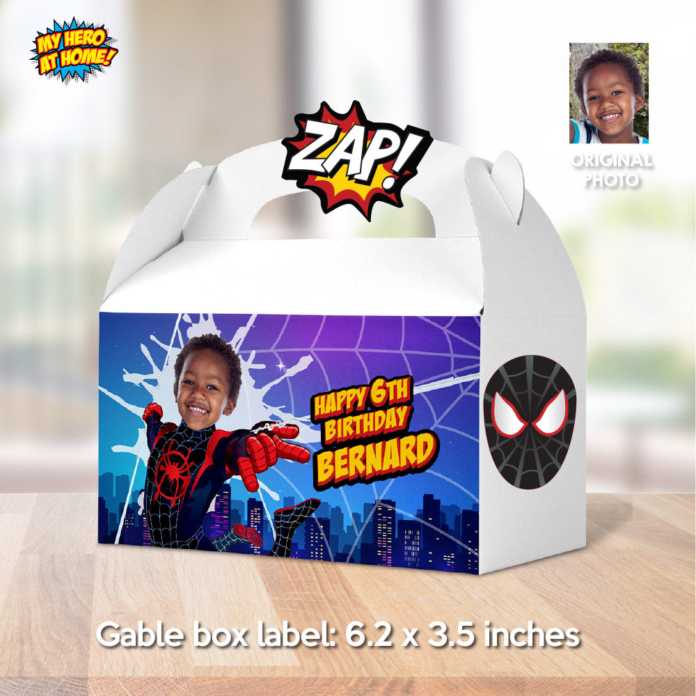 Personalized Miles Morales Gable Box label with birthday boy as the star, Spiderverse favors. 399GB