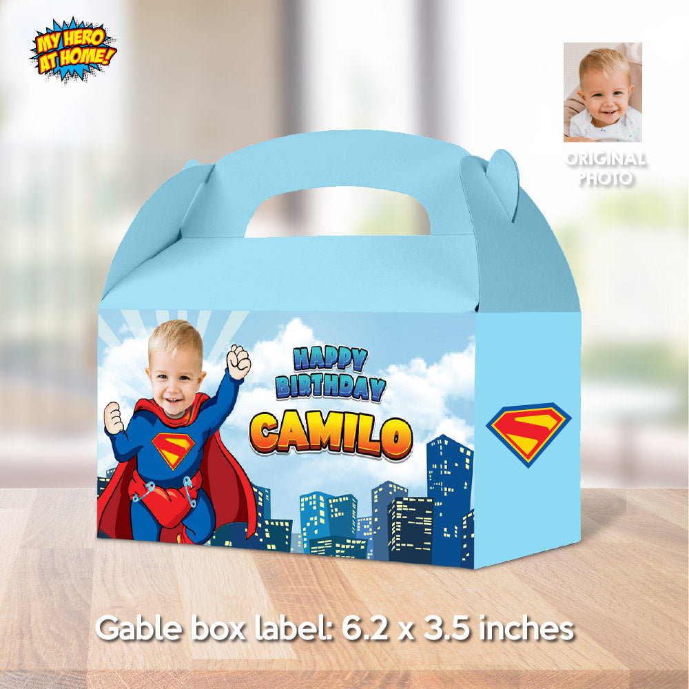 Customized Baby Superman-themed gable box design with your baby as Superman!Gable box label themed Baby Superman, Super baby boy gift box label with photo, Super Baby Gable box label with photo, Super Baby Party snacks, Super Baby Birthday party favors, Superman 1st birthday favors labels, Superman theme 1st party, Super Baby party box favor, Super Baby Boy Gable Box Party favors, Superman 1st birthday party favors