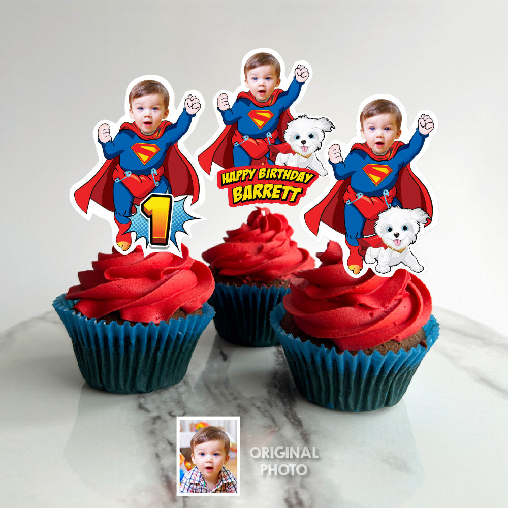 Super Baby and Krypto Cupcake Toppers with your Photo, Baby Superman with Krypto 1st Party Cupcakes. 2351CK