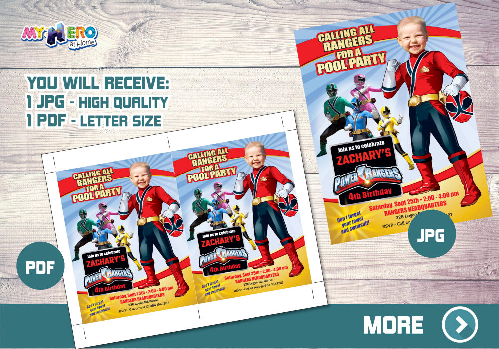 Power Rangers Pool Party Invitation with your kid as the Red Power Ranger. 001P