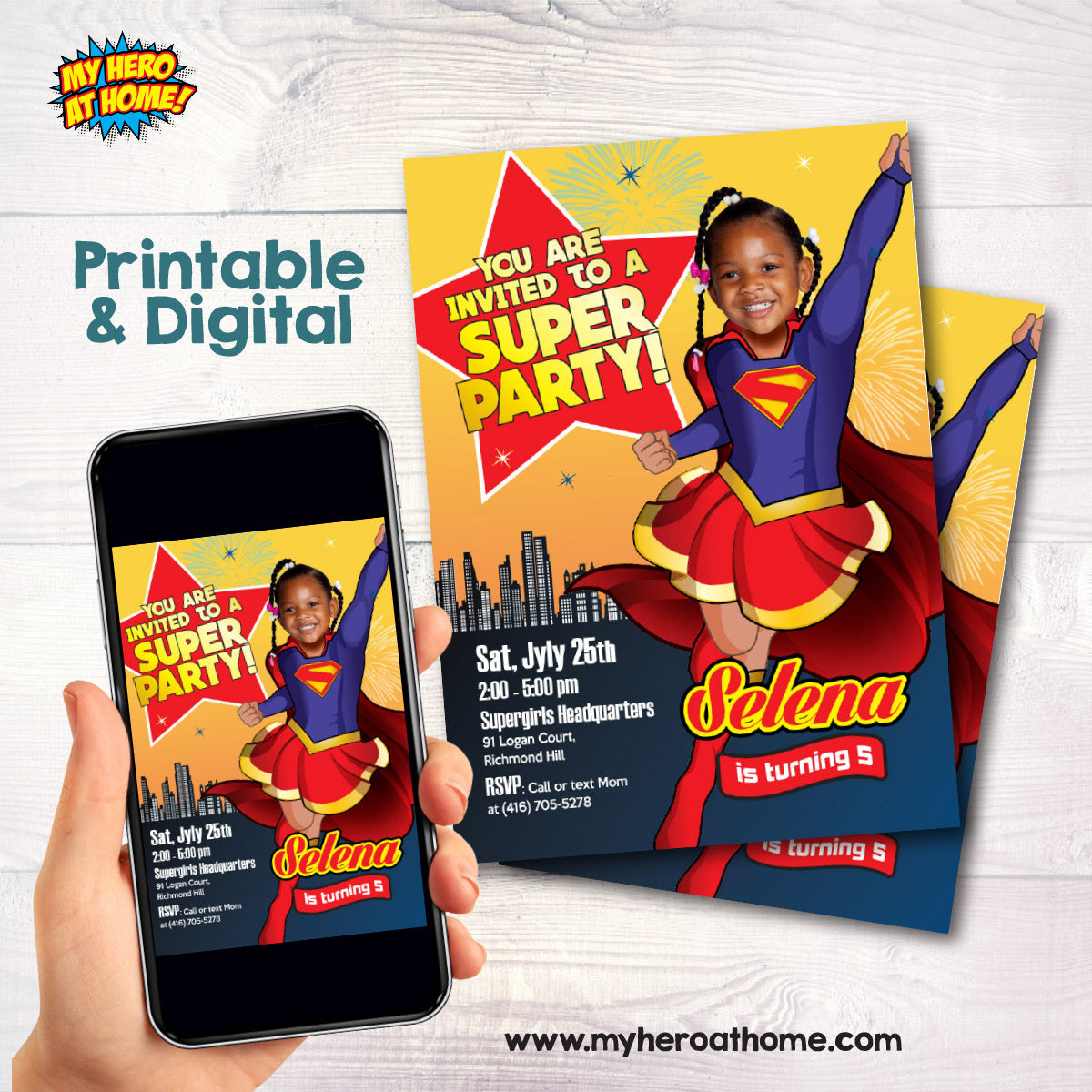 Supergirl photo Invitation, Supergirl Birthday Invitation with your girl as the star. 113IN