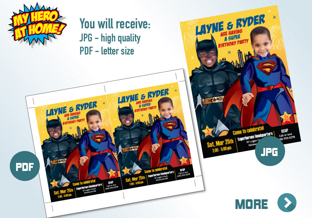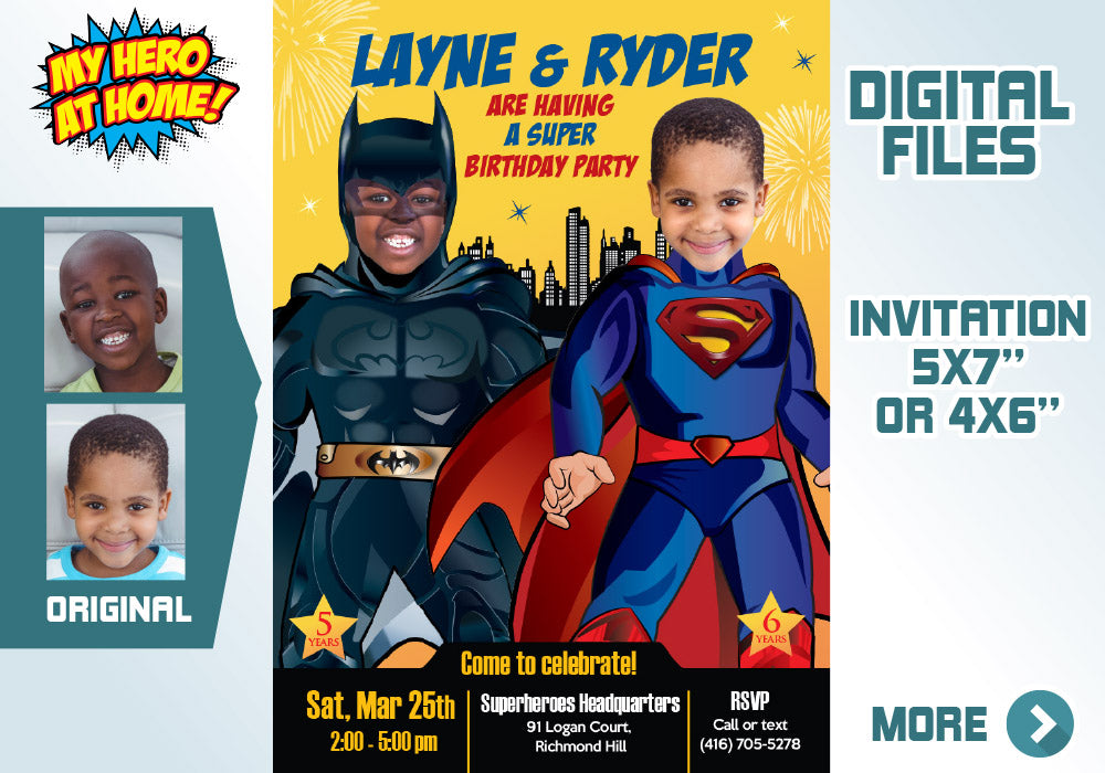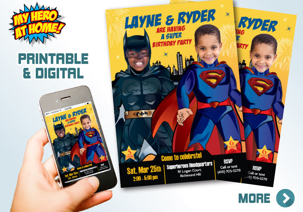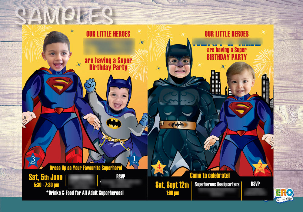 Turn your kids in Superman and Batman for their personalized Joint Superheroes Invitation, Superman and Batman party invitation, Superman and Batman theme party, Batman Superman siblings invitation, Heroes siblings birthday, Joint super heroes digital invitation.