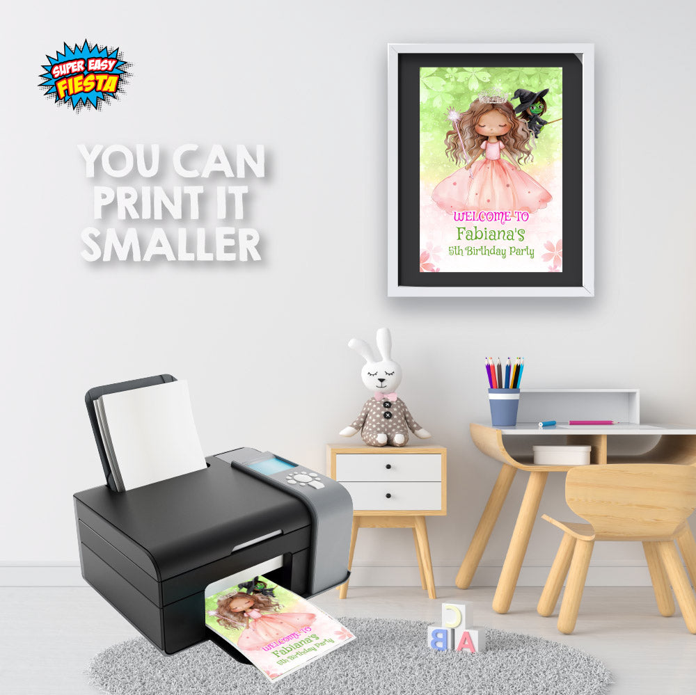 Greet your guests with an enchanting Wicked watercolor welcome sign featuring African American Glinda. Perfect for setting the scene at your entrance, dessert table, or photo area. Personalize with your child’s name and age for a truly magical welcome to their Wicked birthday celebration.