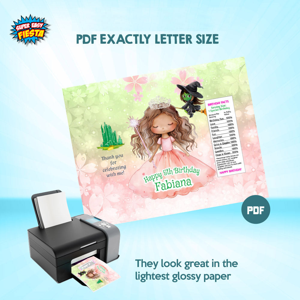 Add a magical Wicked touch to your snack table with these African American Glinda watercolor chip bag wrappers. Featuring beautiful hand-painted illustrations and matching party colors, these wrappers can be customized with your child’s name and age. Perfect for chips, cookies, candies, or small snacks. Simply print, wrap, and seal for a stunning party display.