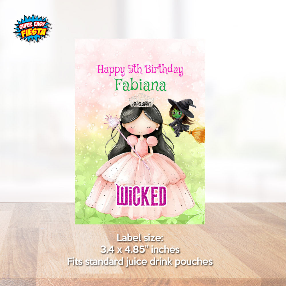 Wicked Black Hair Pink Princess Birthday Water Juice Labels, Brunette Glinda Capri. 1747WJC