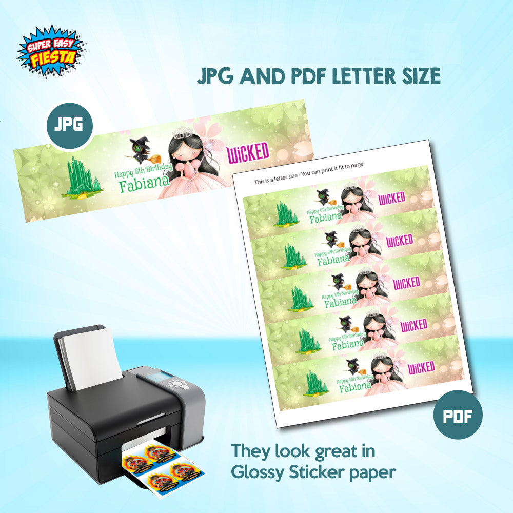 Wicked Brunette Dark Hair Glinda Birthday Party Water Bottle Labels. 1747WJW